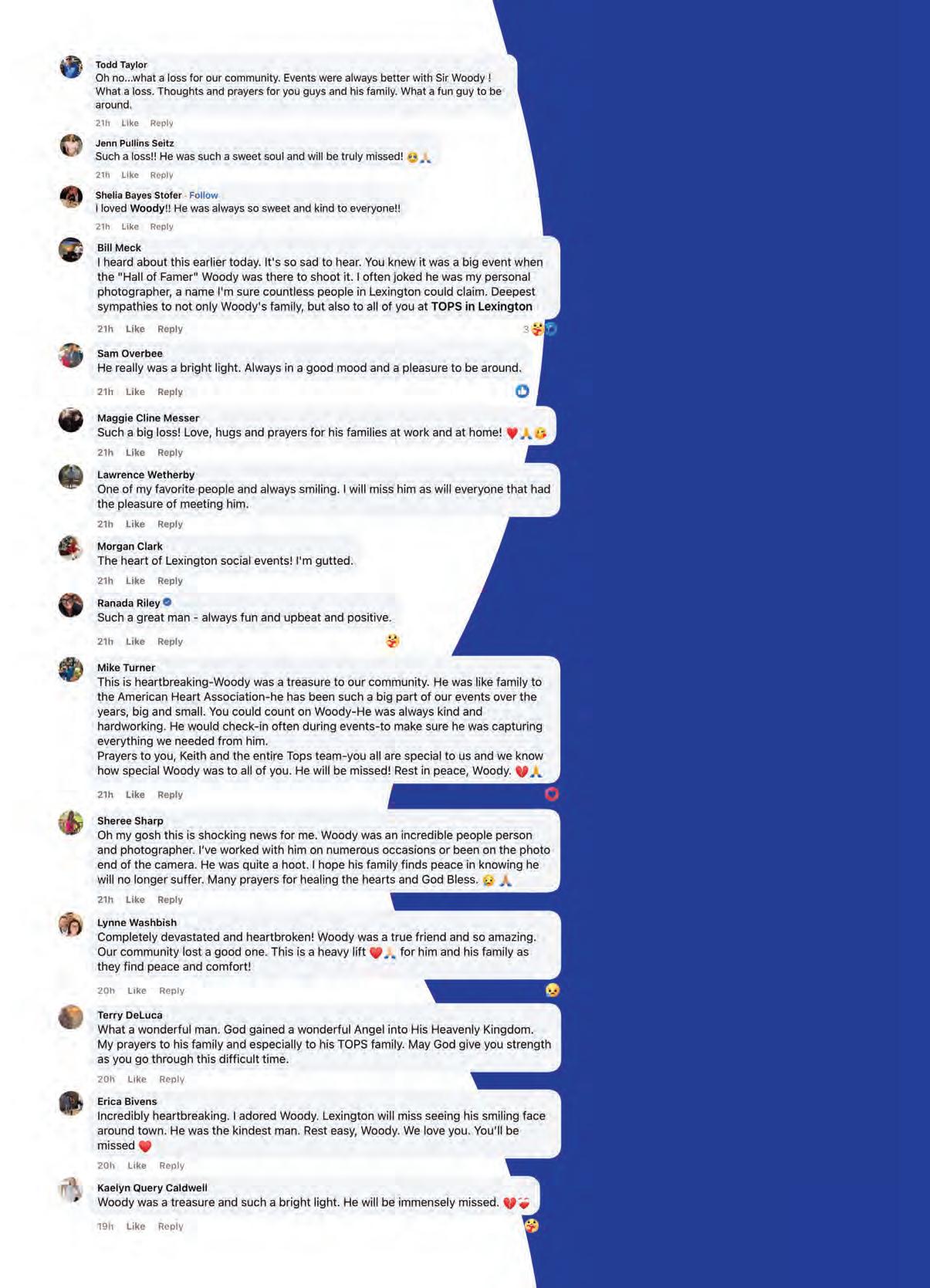 Including Nancy, his wife of 47 years, Woody is survived by two daughters, Sarah White (Josh) and Karla Phillips (Brandon Cheak); four grandchildren, Parker White, Beckett White, Silas Cheak, and Poppy Cheak (born January 23); and two sisters, Patty Goss and Janet Goodlett, both of Lawrenceburg. He will be missed by his TOPS family, and this community. The outpouring of love for this kind-hearted man was overwhelming, and we know you will miss seeing his smiling face at events across the region. We certainly will.