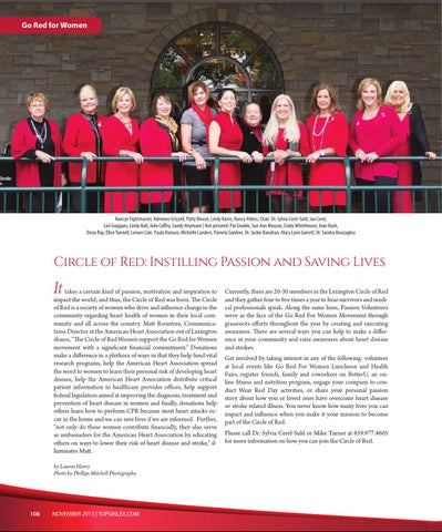 takes a certain kind of passion, motivation and inspiration to impact the world; and thus, the Circle of Red was born. The Circle of Red is a society of women who drive and influence change in the community regarding heart health of women in their local community and all across the country. Matt Rountree, Communications Director at the American Heart Association out of Lexington shares, “The Circle of Red Women support the Go Red for Women movement with a significant financial commitment.” Donations make a difference in a plethora of ways in that they help fund vital research programs, help the American Heart Association spread the word to women to learn their personal risk of developing heart disease, help the American Heart Association distribute critical patient information to healthcare provider offices, help support federal legislation aimed at improving the diagnosis, treatment and prevention of heart disease in women and finally, donations help others learn how to perform CPR because most heart attacks occur in the home and we can save lives if we are informed. Further, “not only do these women contribute financially, they also serve as ambassadors for the American Heart Association by educating others on ways to lower their risk of heart disease and stroke,” illuminates Matt. by Lauren Henry Photo by Phillips Mitchell Photography