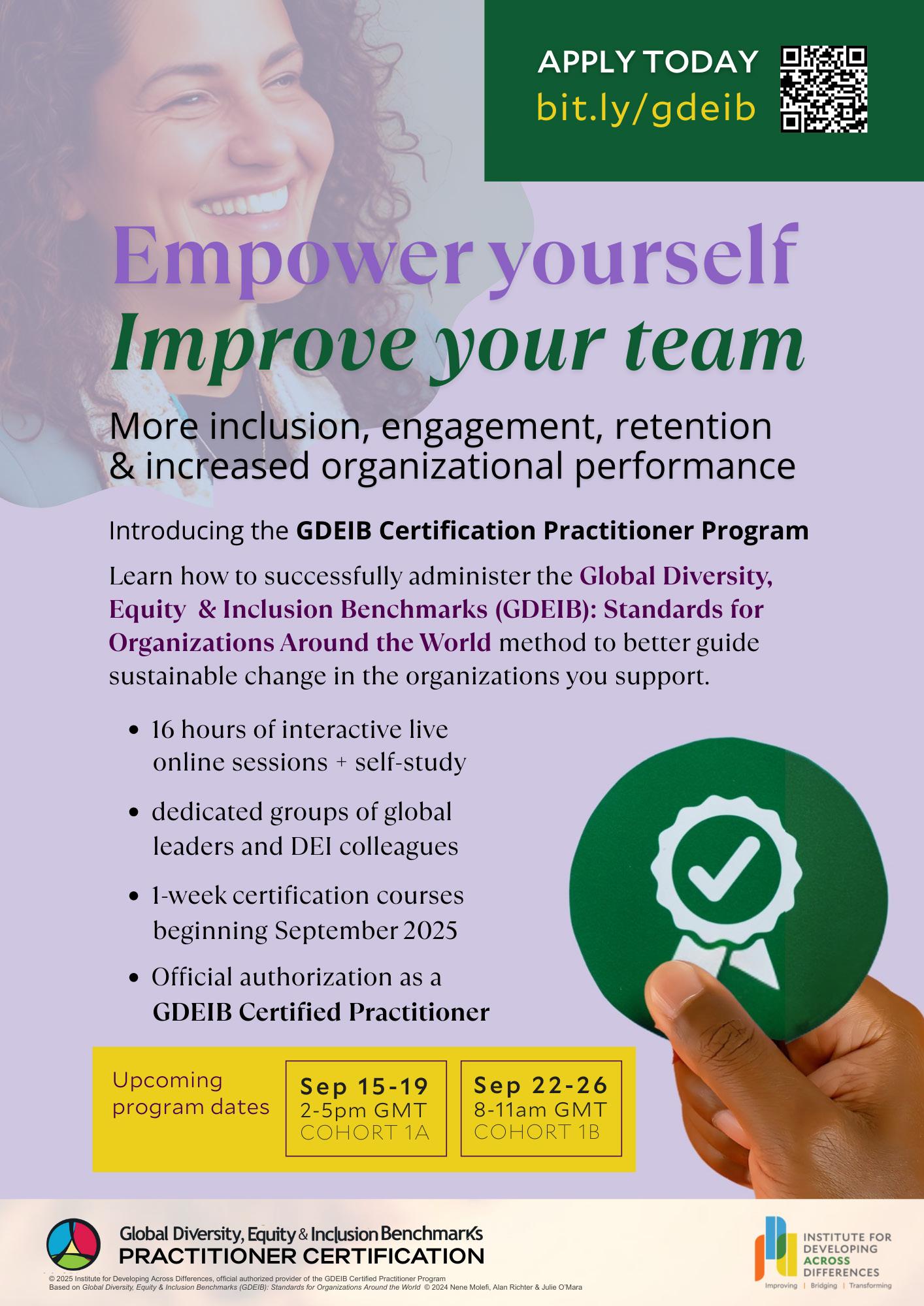 The global landscape of diversity, equity, and inclusion (DEI) is ever-evolving, demanding advanced tools and expertise. Exciting news for DEI professionals worldwide! The official practitioner certification program for users of the Global Diversity, Equity, and Inclusion Benchmarks: Standards for Organizations Around the World (GDEIB) is launching in September 2025. Developed in partnership between co-authors Nene Molefi, Dr. Alan Richter, and Julie O’Mara and the Institute for Developing Across Differences (IDD), this intensive 16-hour online program is set to transform DEI practices.