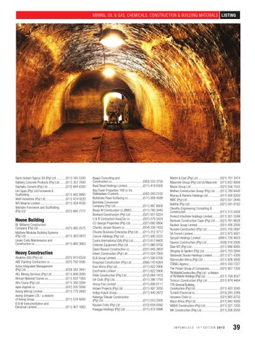 Martin & East (Pty) Ltd............................(021) 761 3474 Mascrete Group (Pty) Ltd t/a Mascrete (011) 837 8806 Mazor Group Ltd....................................(021) 556 1555 Motheo Construction Group (Pty) Ltd.......(011) 789 8440 Murray & Roberts Holdings Ltd...............(011) 456 6200 NMC (Pty) Ltd........................................(021) 551 2640 Nolitha (Pty) Ltd.....................................(021) 591 8183 Olwethu Engineering Consulting & Construction..........................................(011) 315 0428 Protech Khuthele Holdings Limited..........(011) 301 5599 Rainbow Construction Cape (Pty) Ltd.......(021) 761 8628 Raubex Group Limited............................(051) 406 2000 Rumdel Construction (Pty) Ltd.................(031) 700 2697 SA French Limited..................................(011) 975 4921 Sanyati Holdings Limited......................(0861) 726 4653 Sawren Construction (Pty) Ltd.................(028) 316 2926 Slab-KIT (Pty) Ltd...................................(011) 886 8065 Slingsby & Gaidien (Pty) Ltd....................(021) 703 2840 Stefanutti Stocks Holdings Limited..........(011) 571 4300 Steinmuller Africa (Pty) Ltd .....................(011) 806 3000 TDB&C Agency......................................(051) 430 7227 The Power Group of Companies..............(021) 907 1300 TN MolefeConstruction (Pty) Ltd - a division of TN Molefe Holdings (Pty) Ltd....................(011) 794 8527 Trencon Construction (Pty) Ltd................(011) 974 4464 TTR General Building Construction (Pty) Ltd...............................(011) 403 3045 Tumishi Electrical cc...............................(015) 293 2288 Umzamo Civils cc...................................(021) 905 8732 Waco Africa (Pty) Ltd..............................(011) 842 4000 WBHO Construction (Pty) Ltd..................(011) 321 7200 WK Construction (Pty) Ltd.......................(011) 206 2000
