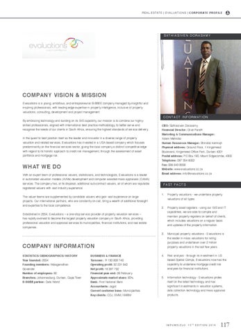 COMPANY VISION & MISSION Evaluations is a young, ambitious, and entrepreneurial B-BBEE company managed by insightful and inspiring professionals, with leading edge expertise in property intelligence, inclusive of property valuations, consulting, development and project management.
