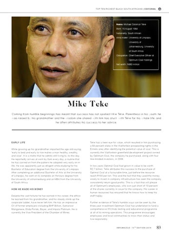 Name: Michael Solomon Teke Born: 15 August 1964 Nationality: South African Alma mater: University of Limpopo, University of Johannesburg, University of South Africa Occupation: Chief Executive Officer at Optimum Coal Holdings Net worth: R682-million