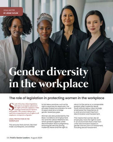 In addition to legislation protecting women in the workplace, South Africa's laws also aim to foster an inclusive and diverse work environment and address historical gender imbalances. Employment Equity legislation encourages employers to implement affirmative action measures to redress disadvantages in the workplace.