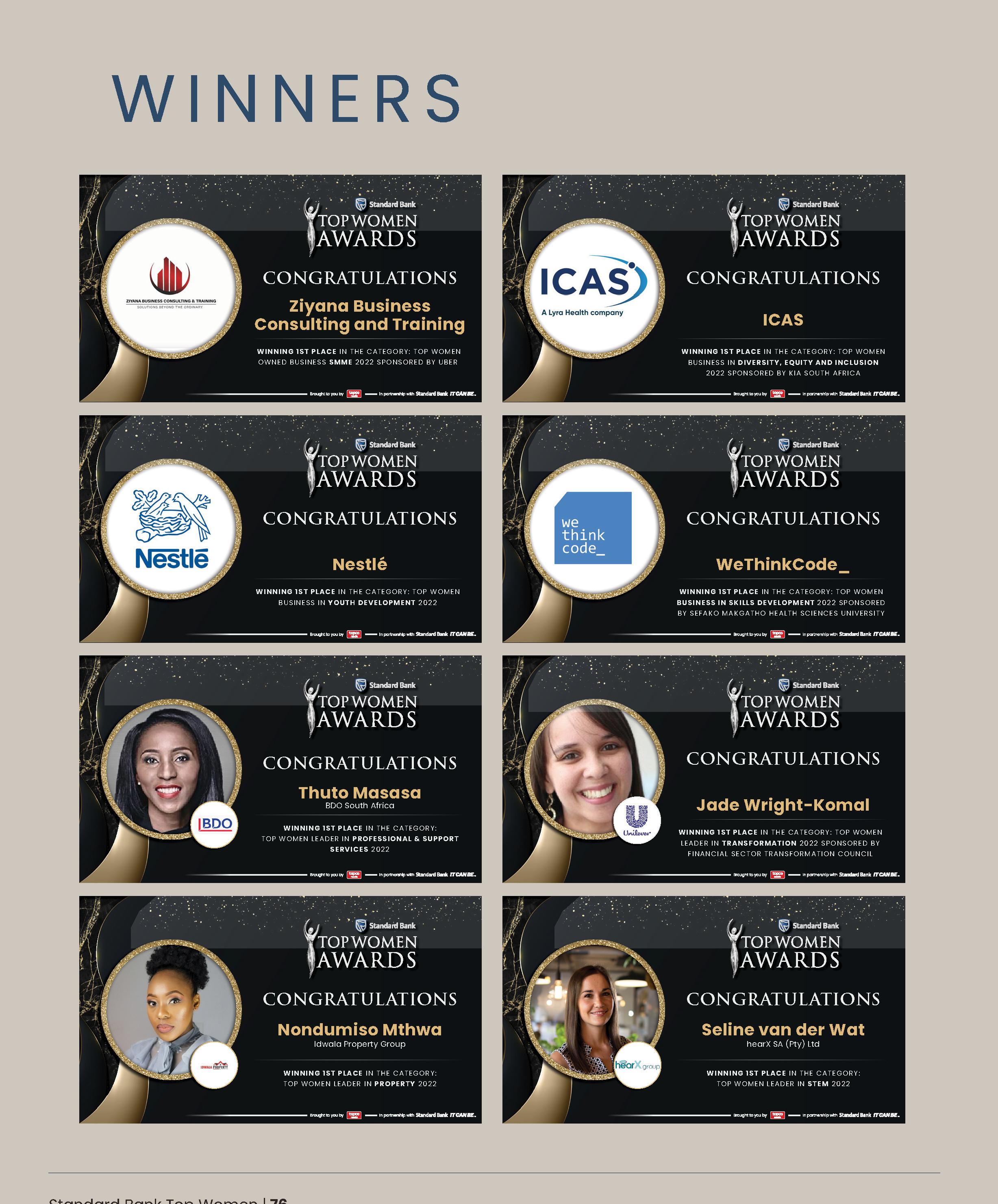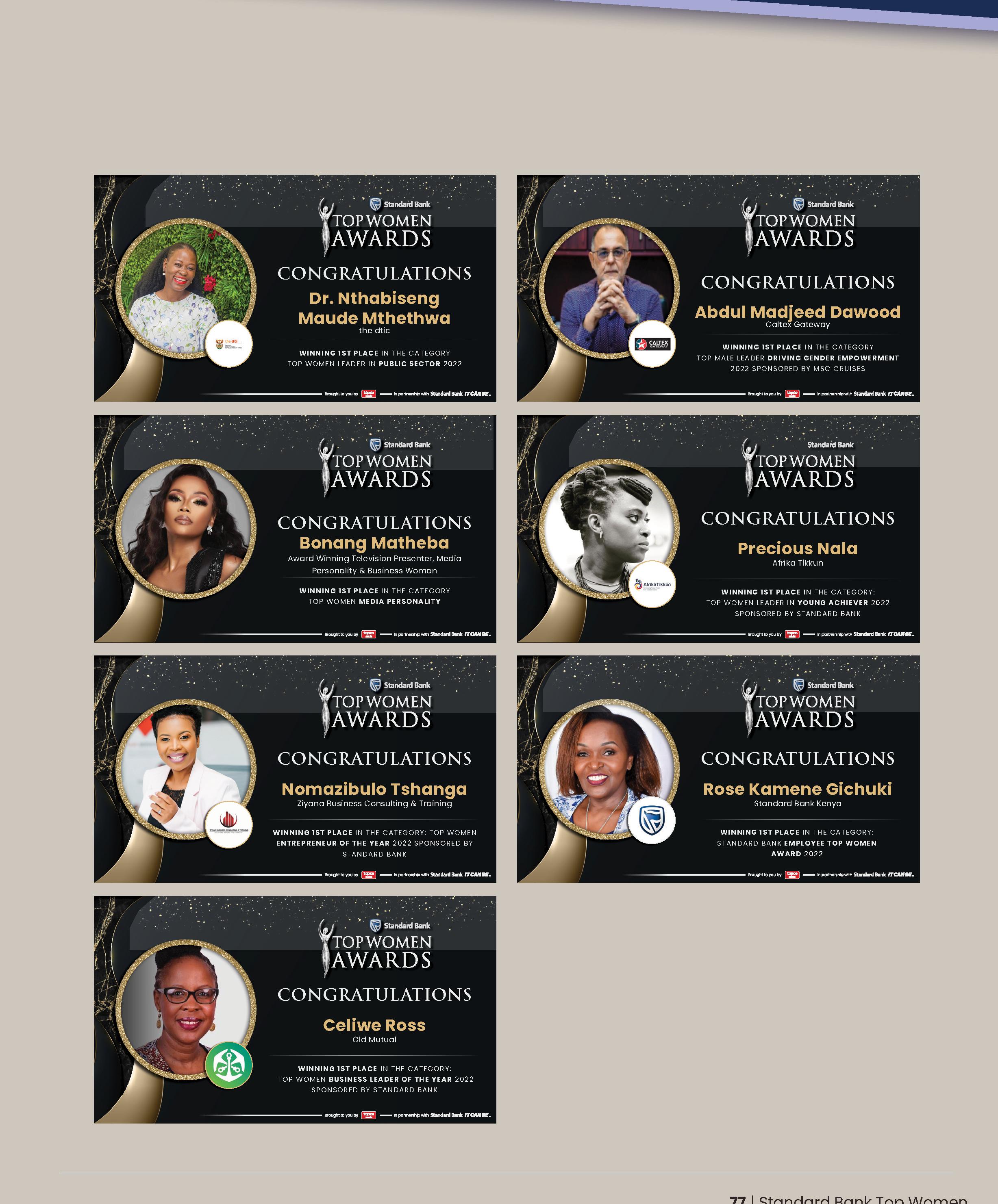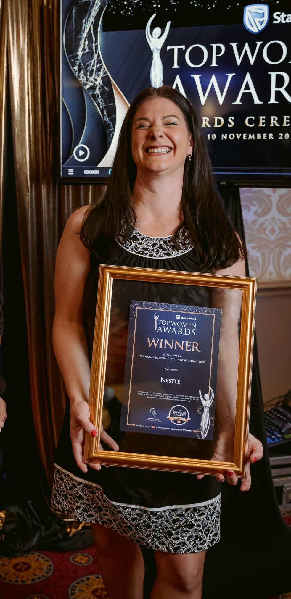 104 HON. NALEDI PANDOR Standard Bank Top Women Lifetime Achiever 106 ROSE KAMENE GICHUKI Standard Bank Top Women Internal Award Winner 108 NOMAZIBULO TSHANGA Standard Bank Top Entrepreneur of the Year 110 PRECIOUS NALA Standard Bank Top Women Young Achiever of the Year 112 NESTLÉ Standard Bank Top Women Business of the Year 56 60 64 STANDARD BANK TOP WOMEN LEADERS 5