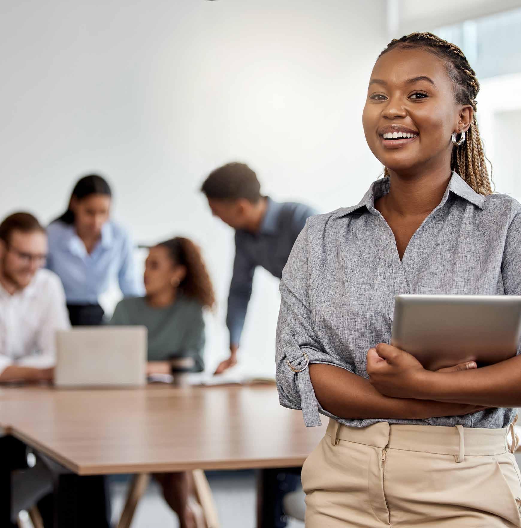 TOP WOMEN ACROSS THE BOARD 134 DR PHUMZILE MLAMBO-NGCUKA 136 MAMONGAE MAHLARE 138 KIMBERLEY TAYLOR 140 DR CAROLINE PULE 142 MARJORIE SAINT-LOT How Uber is empowering women in Africa 144 BERTINA ENGELBRECHT A powerhouse at the forefront of gender empowerment 146 DR NTHABISENG MAUDE MTHETHWA 148 TSHEGOFATSO SIBAMBATO Engineering a career INTERVIEWS 176 ALLISON AMARACHUKWU Somewhere between an entrepreneur and a doctor 178 MADELEIN BARKHUIZEN 180 SENAMILE MASANGO 182 KATIE MOHAMED CEO of BrandFusion and Founder of W-Suite 184 RACHELLE BEST 186 ROSHANA BURNETT 188 TARRYN KNIGHT 190 MARINA CONSTAS Standard Bank Group TIPS & ADVICE 204 A SURVIVAL GUIDE FOR NEW LEADERS 206 ENTREPRENEURSHIP 210 MEET DEANNE CHATTERTON Team building and talent retention 212 RESILIENCE AND READINESS A coaching culture for a resilient business 214 NAILING YOUR NEXT BROADCAST INTERVIEW Being nervous is normal 216 EDUTECH edtech startup 220 THE SWEET SPOT 222 WORK-LIFE 224 TAKING CARE OF YOURSELF AT