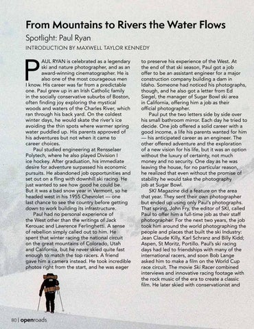 AUL RYAN is celebrated as a legendary ski and nature photographer, and as an award-winning cinematographer. He is also one of the most courageous men I know. His career was far from a predictable one. Paul grew up in an Irish Catholic family in the socially conservative suburbs of Boston, often finding joy exploring the mystical woods and waters of the Charles River, which ran through his back yard. On the coldest winter days, he would skate the river’s ice avoiding the thin spots where warmer spring water puddled up. His parents approved of his adventures but not when it came to career choices. Paul studied engineering at Rensselaer Polytech, where he also played Division I ice hockey. After graduation, his immediate desire for adventure surpassed his economic pursuits. He abandoned job opportunities and set out on a fling with downhill ski racing. He just wanted to see how good he could be. But it was a bad snow year in Vermont, so he headed west in his 1955 Chevrolet — one last chance to see the country before getting down to work building its infrastructure. Paul had no personal experience of the West other than the writings of Jack Kerouac and Lawrence Ferlinghetti. A sense of rebellion simply called out to him. He spent that winter racing the national circuit on the great mountains of Colorado, Utah and California, but he never skied quite fast enough to match the top racers. A friend gave him a camera instead. He took incredible photos right from the start, and he was eager