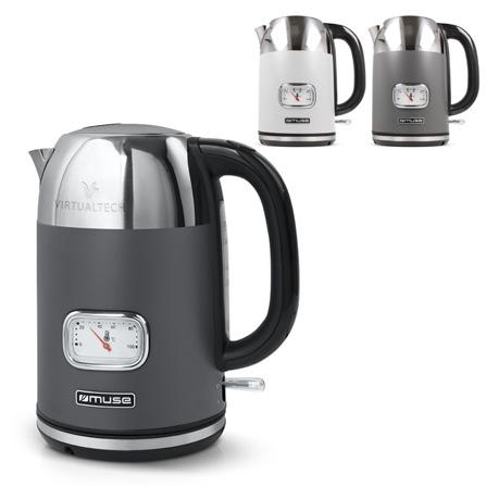 Dieser stilvolle Wasserkocher von Muse hat ein Fassungsvermögen von 1,7 Litern. Dieser Wasserkocher im Retro-Stil kombiniert moderne Technologie mit VintageDesign. Der Wasserkocher ist mit einer Wasserstandsanzeige und einer analogen Temperaturanzeige ausgestattet.