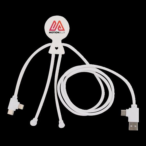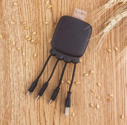 valmistettu RPET:stä ja kierrätysmuovista. Yhdellä USB-tuloliitännällä ja kolmella eri liittimellä laitteiden lataamiseen. Kaapeli on pakattu kestävään FSC-sertifioituun paperikuoreen. Koko: 114x35x12mm