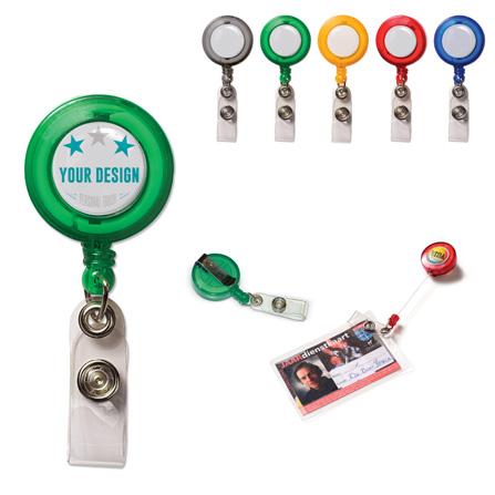 Transparenter Namensschildhalter mit Ausziehband: 50cm und Clip auf der Rückseite. Werbeanbringung mittels Doming.