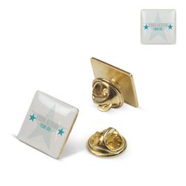 A square pin with doming. Butterfly closure. Measurement: 11 x 15 x 15 mm