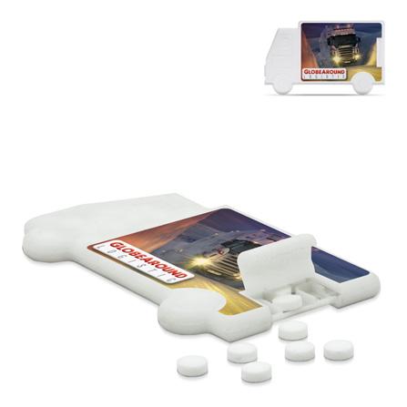 Peppermint box in the shape of a truck. The opening of the box is at the back of the truck. Circa seven grams of sugerfree peppermints. Available for full-colour digital print. Product safety directive on every tin.