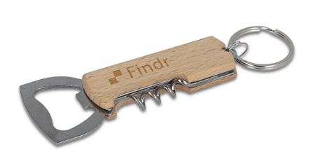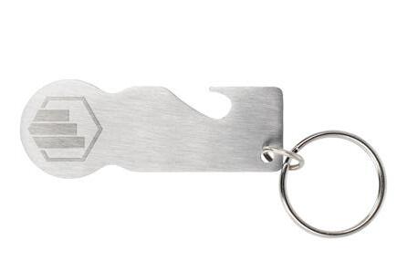 Metallinen avaimenperä, jossa pullonavaaja. Linssitarramerkkaus.