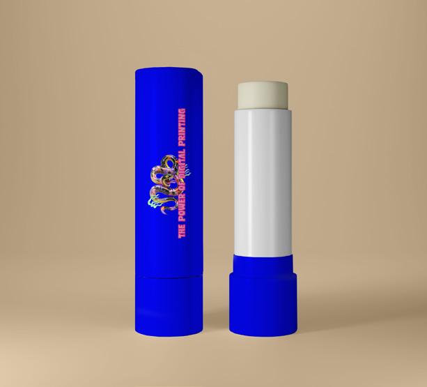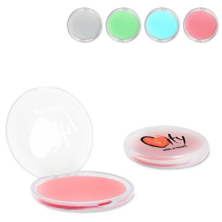 Lippenbalsam (SFP15) in einem runden Gehäuse. An der Unterseite des Stifts ist ein Drehmechanismus zum herausdrehen des Pflegestifts. Lieferbar in transparenten Farben oder einfarbig in schwarz oder weiß.