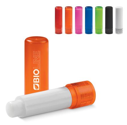 Lippenbalsem in ronde stick. Onderkant van de stick is voorzien van draaimechanisme om de balsem (SPF15) naar boven te draaien. In transparante kleuren of in hardcolour zwart of wit.