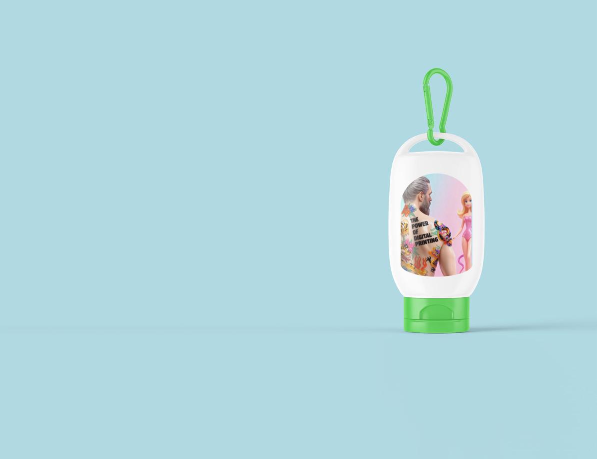 Praktisk solkräm med SPF30 i en kompakt behållare av återvunnen plast med karbinhake. Lätt att fästa på väskor, vilket gör den idealisk för festivaler, utomhusevenemang eller när du är på språng.