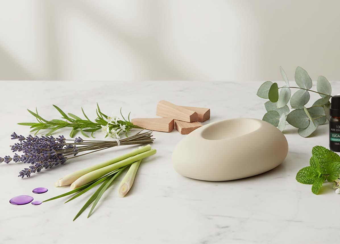 Skapa en lugnande atmosfär med Aroma Pebble Giftset med 6 eteriska oljor. Den oglaserade keramikstenen absorberar olja utan värme eller elektricitet.
