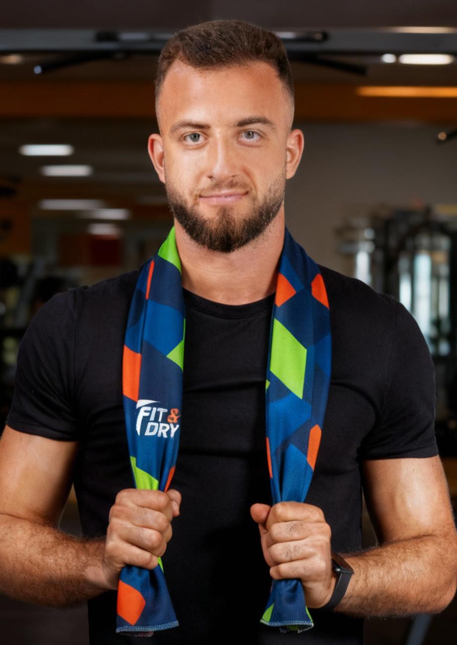 Tør sveden af under træning. Dette hurtig tørrende mikrofiberfitnesshåndklæde holder dig tør. Det er inklusiv fuldfarveprint på den ene side og en valgfri fuldfarveprint på bagsiden. Derudover kan farven på sømmen justeres.
