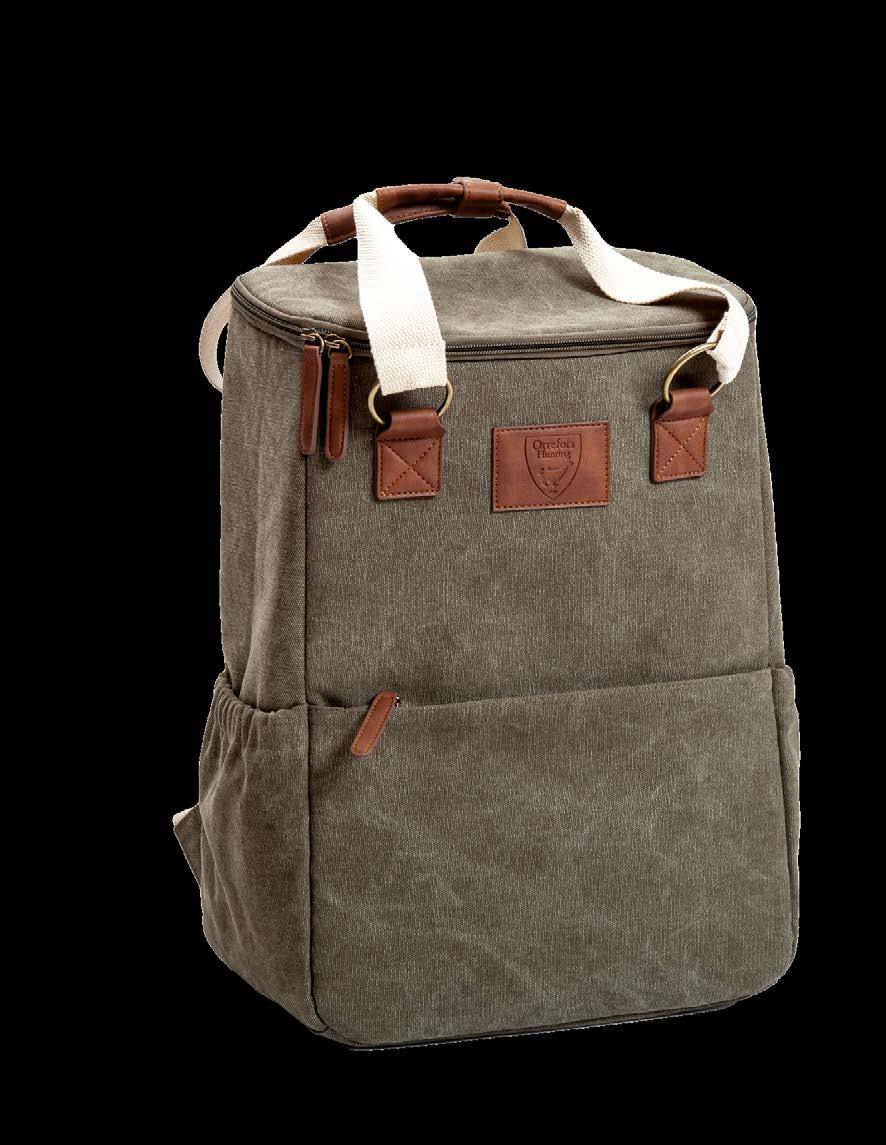Borsa frigo in tela Orrefors Hunting. Elegante borsa frigo compatta a zaino in tela robusta, con ampio scomparto principale e tre tasche più piccole per gli accessori. Esterno in resistente tessuto di tela con robuste cinghie posteriori regolabili. Dimensioni: 130 x 240 x 350 mm
