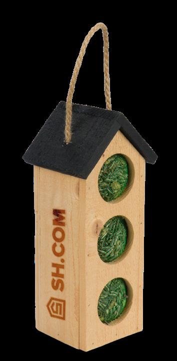 Dit vogel voederhuis heeft een moderne uitstraling door het zwarte dak. Door het touw aan de bovenkant is het eenvoudig op te hangen aan een tak of haak. Door de vijf verschillende ingangen kunnen er meerdere vogels tegelijk eten. Dit voederhuis is afgevuld met diverse soorten vogelvoeding. Afmeting: 105x90x350mm