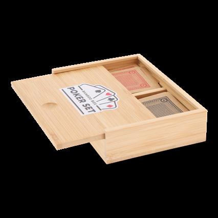 Een bamboe doos verpakt met 2 kaartspellen. Met deze set ben je klaar voor iedere spelletjesavond. Afmeting: 108x152x35mm