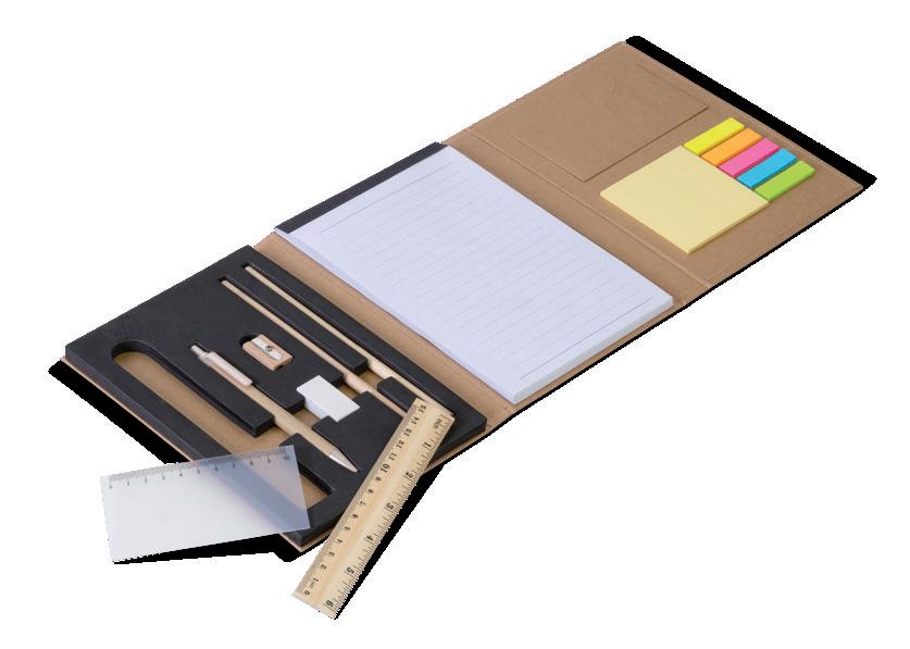Ultieme stationery set met alles wat er op een bureau nodig is. Van een houten liniaal, potloden, gum, puntenslijper, flexibele liniaal tot een notitieblok, zelfklevende memoblaadjes, index markers en een pen. Afmeting: 155x25x210mm