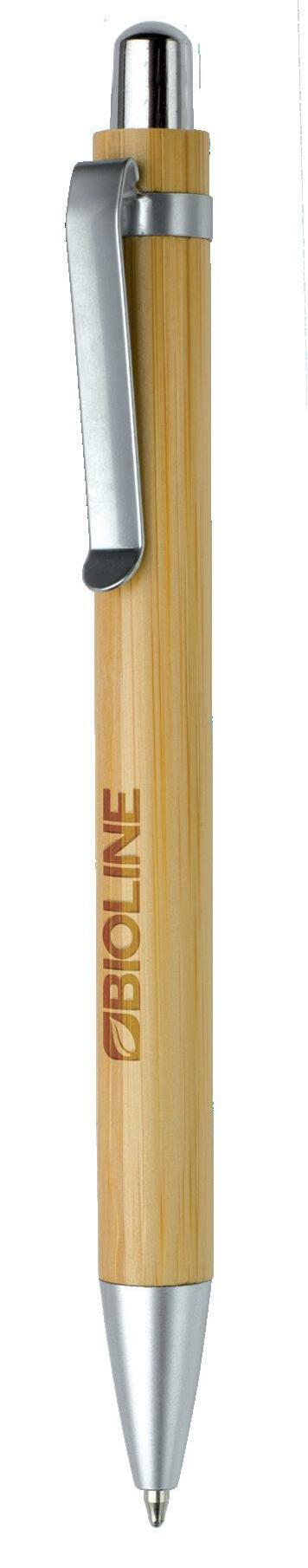 Bamboo material ball pen with metalized pusher and tip. The clip is made of metal.