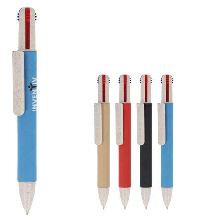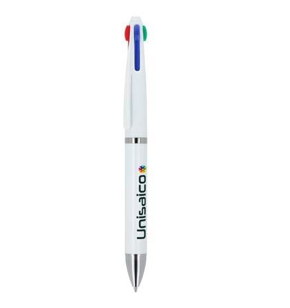 Unik överstrykningspenna med fyra skrivfärger i en. Överstrykningspennan har mejselspetsar i skrivfärgerna gul, orange, grön och blå.