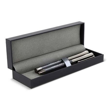 En kulspetspenna i metall och en rullspetspenna i en vacker presentförpackning. Det här setet kan märkas efter dina önskemål, vilket gör det idealiskt för att marknadsföra ditt företag.