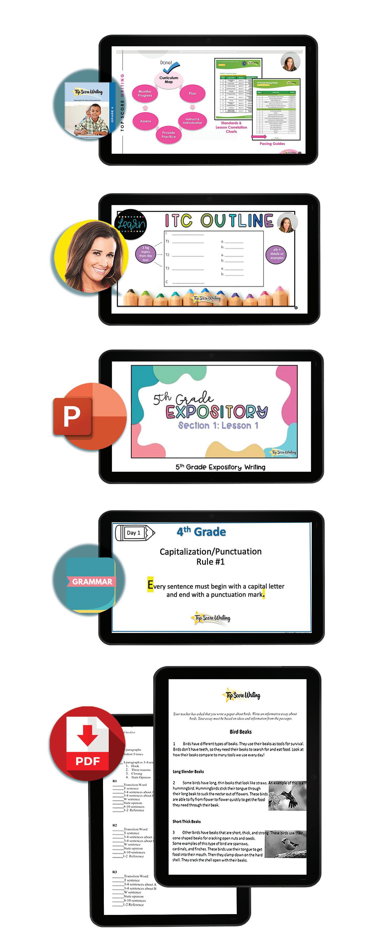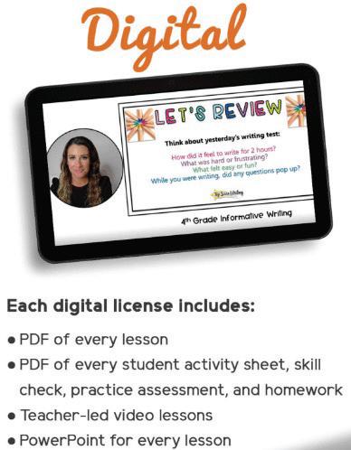 WHAT DOES IT INCLUDE? Our print and digital gradelevel kits consist of 80-112 fun, interactive lessons complete with everything teachers need to teach writing daily for an entire school year. Every module includes step-bystep instructions, modeling, guided and independent practice, activities, homework, quizzes, tests, prompts, and Lexile-leveled reading passages. All lessons and materials are tailor-made for each grade level and follow a specific sequence to master expository/informative, opinion/ argumentative, and narrative writing. For high school students, research papers and college writing are also covered. Our yearly digital license also includes teacher-led video lessons, PowerPoint presentations, and more for every lesson in our curriculum.