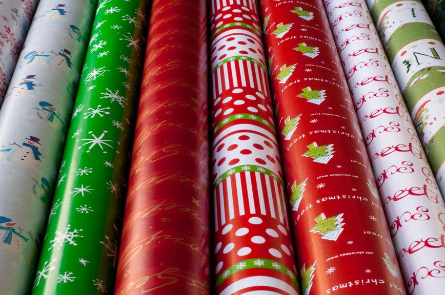 Wrappingpaperthatincludesanyglitter,foil,plastic orothermaterialsbeyondpapershouldbethrown awayinthetrash.Wrappingpaperthat’spaperonly canberecycled!