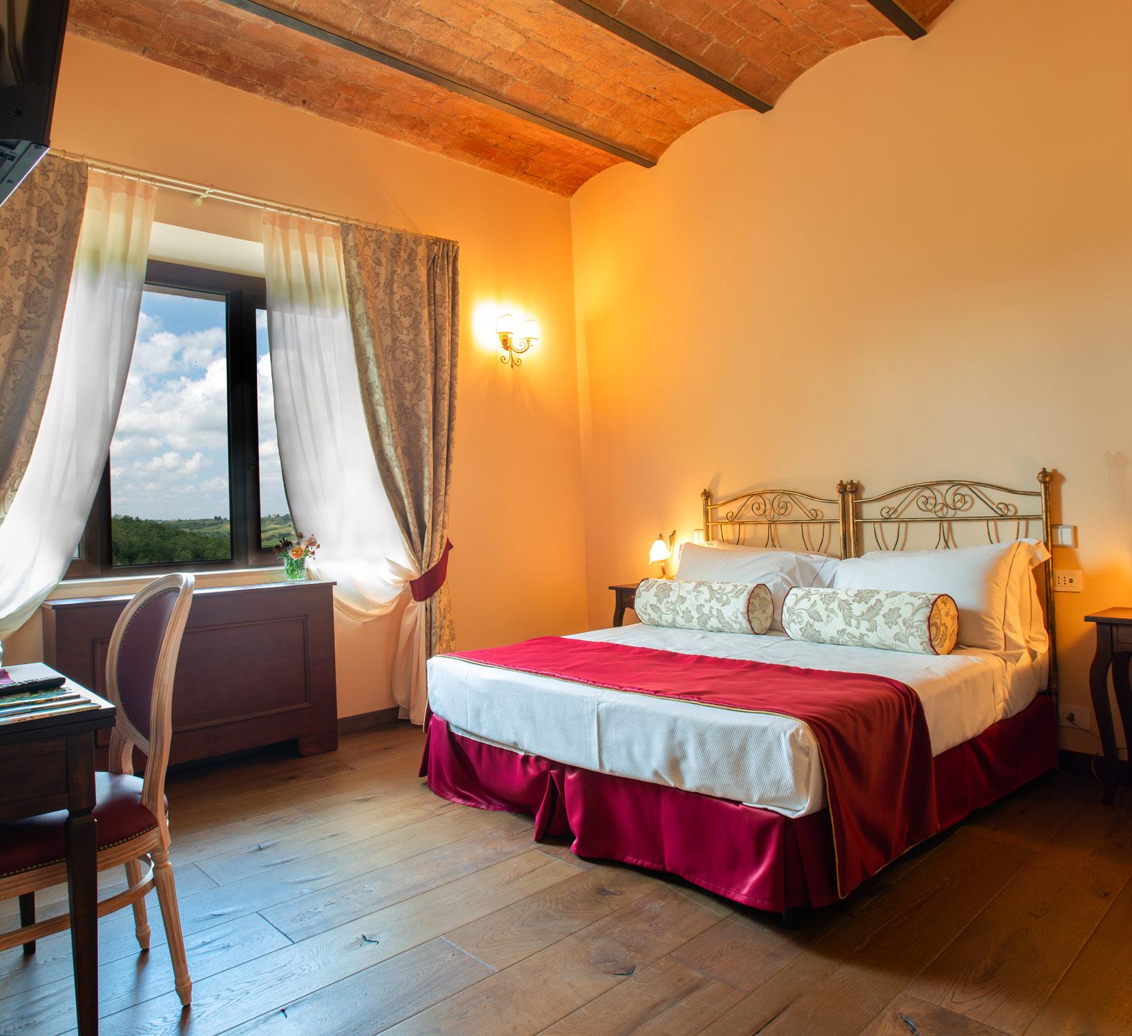 The rooms feature a romantic Tuscan style, with wrought-iron headboards, wooden beam ceilings, terracotta floors, and bathrooms enriched with mosaics and travertine. A perfect combination of tradition and comfort, they offer spectacular views of the Tuscan countryside. Each room is named after one of our wines. Torciano Hotel is the perfect location for a holiday immersed in greenery and the pleasures of the good life in Tuscany.