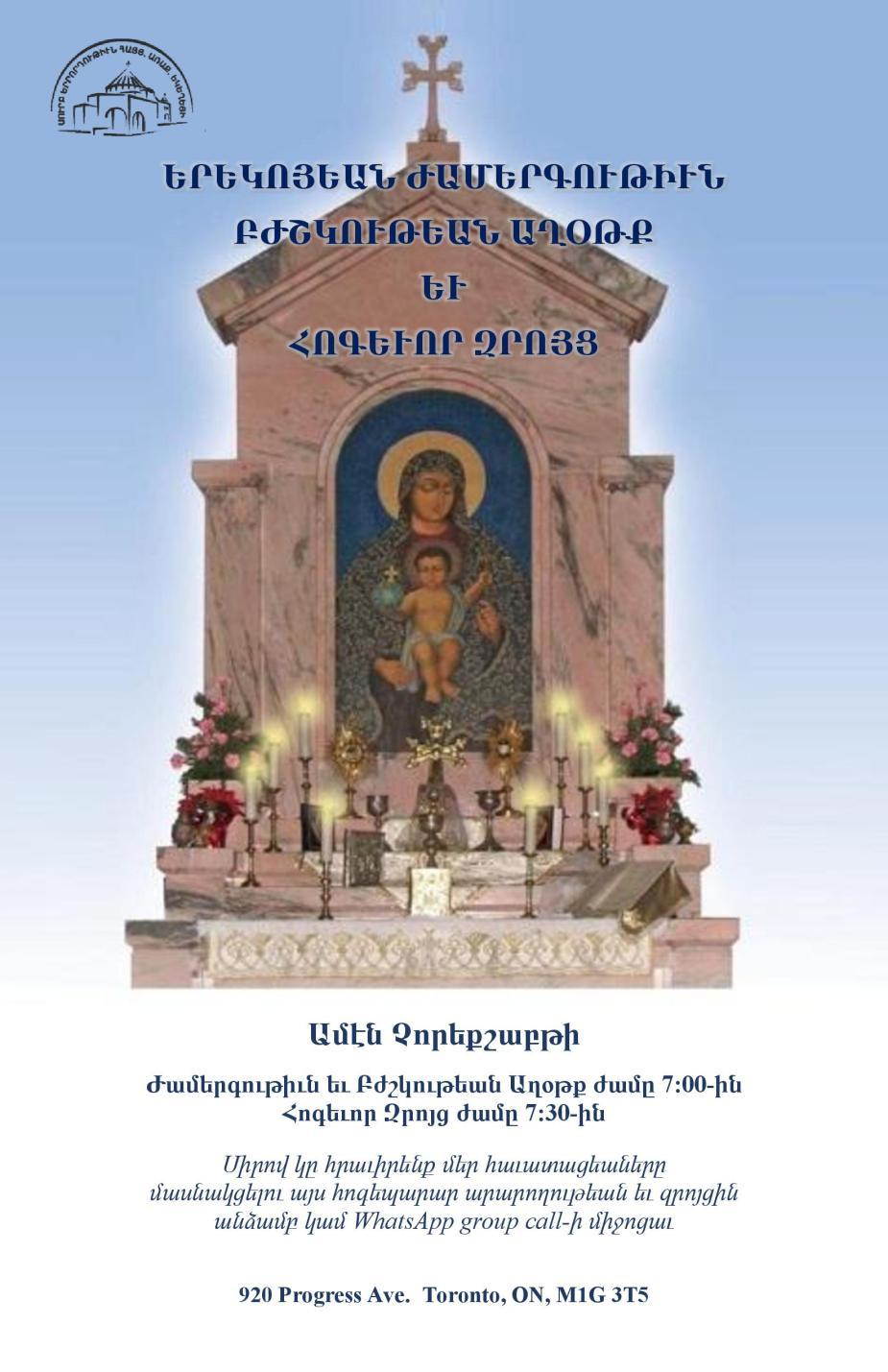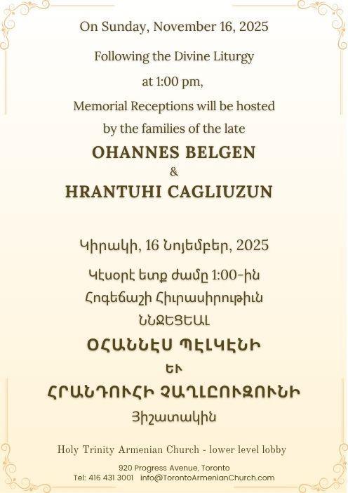920 Progress Ave. Toronto, ON, M1G 3T5 Tel: 416 431 3001 www.TorontoArmenianChurch.com info@TorontoArmenianChurch.com @TorontoArmenianChurch.com