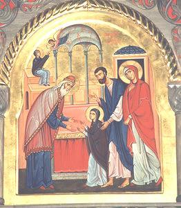 According to Tradition parents of Holy Mother of God, Joachim and Anna prayed for years to have a child, and made a solemn promise, that if a child were born to them, the child would be dedicated to the service of God. God answered their prayers and a daughter was born to them. They named her Mary and did not forget their promise. When Mary was three years old, Joachim and Anna presented her to the Temple . Tradition tells us that she stayed there for about twelve years under the care of devoted women and maidens until she was betrothed to the carpenter named Joseph.