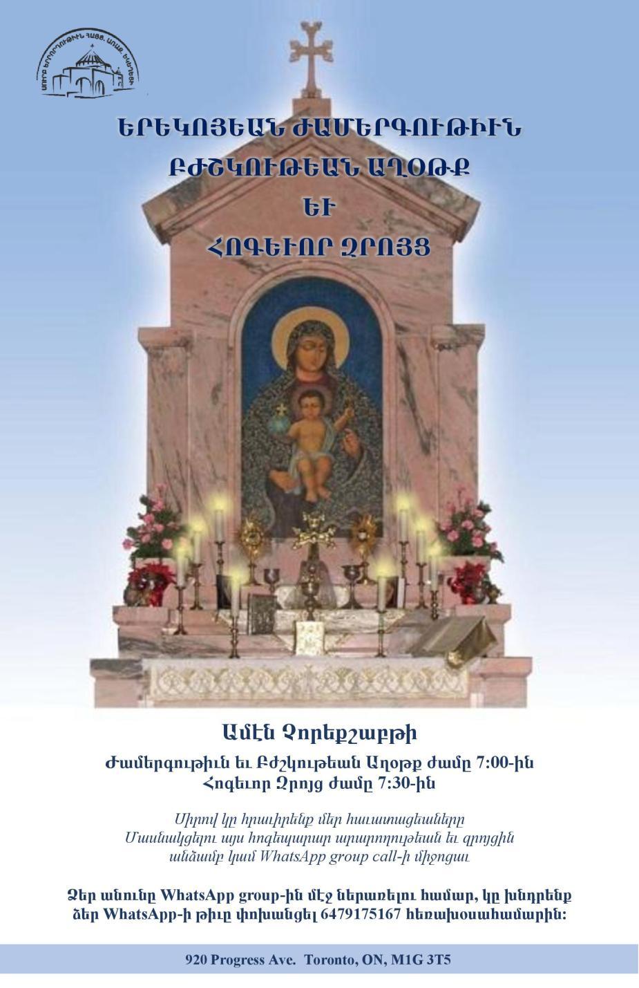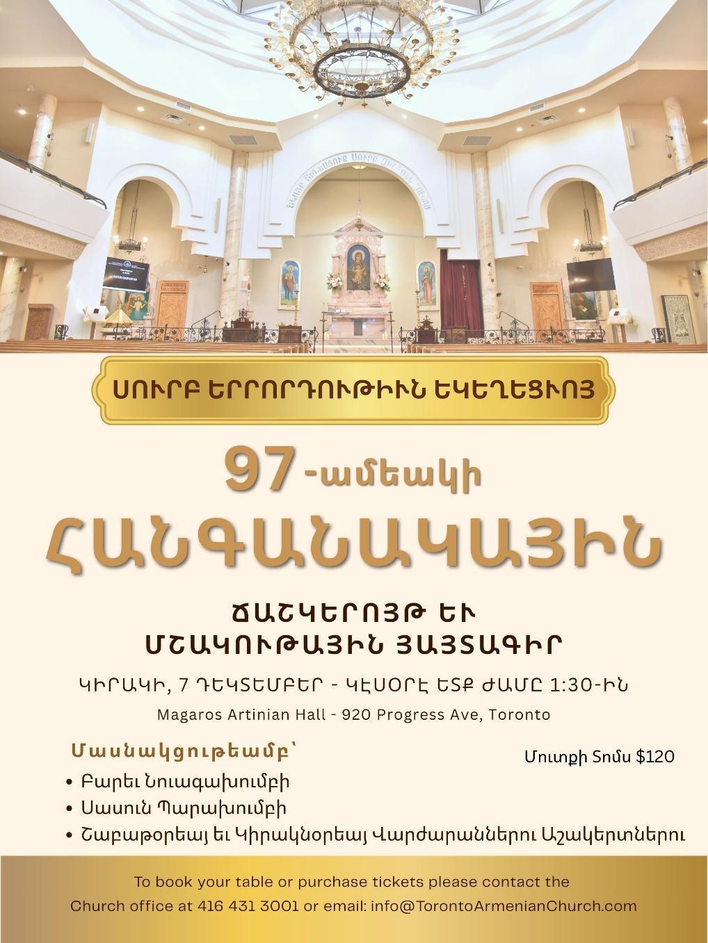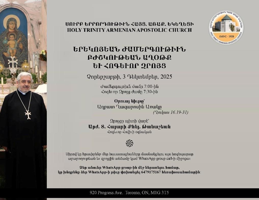920 Progress Ave. Toronto, ON, M1G 3T5 Tel: 416 431 3001 www.TorontoArmenianChurch.com info@TorontoArmenianChurch.com @TorontoArmenianChurch.com