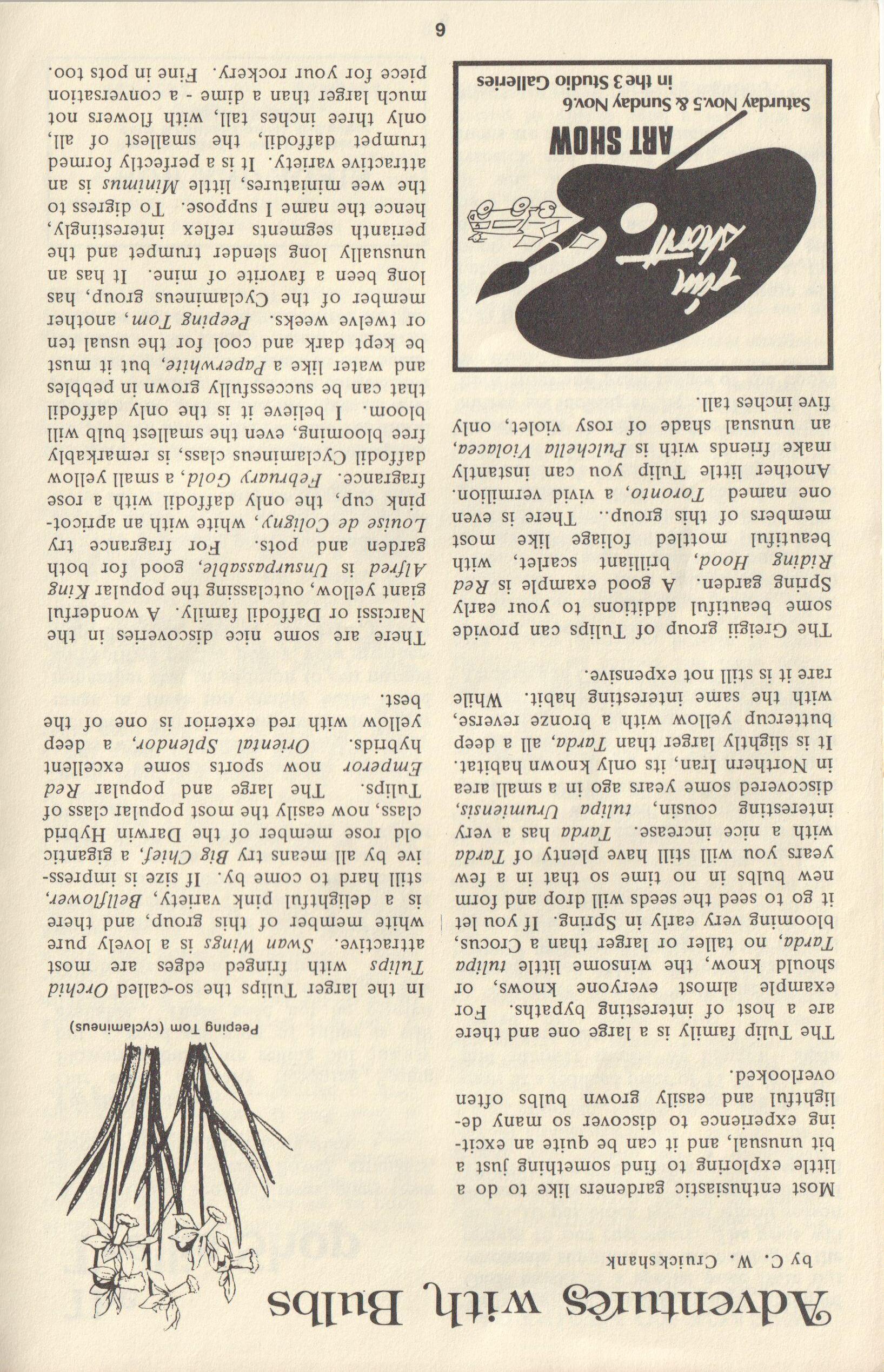 There are some nice discoveries in the Narcissi or Daffodil family. A wonderful giant yellow, outclassing the popular King Alfred is Unsurpassable, good for both garden and pots. For fragrance try Louise de Coligny, white with an apricotpink cup, the only daffodil with a rose fragrance. February Gold, a small yellow daffodil Cyclamineus class, is remarkably free blooming, even the smallest bulb will bloom. I believe it is the only daffodil that can be successfully grown in pebbles and water like a Paperwhite, but it must be kept dark and cool for the usual ten or twelve weeks. Peeping Tom, another member of the Cyclamineus group, has long been a favorite of mine. It has an unusually long slender trumpet and the perianth segments reflex interestingly, hence the name I suppose. To digress to the wee miniatures, little Minimus is an attractive variety. It is a perfectly formed trumpet daffodil, the smallest of all, only three inches tall, with flowers not much larger than a dime - a conversation piece for your rockery. Fine in pots too.