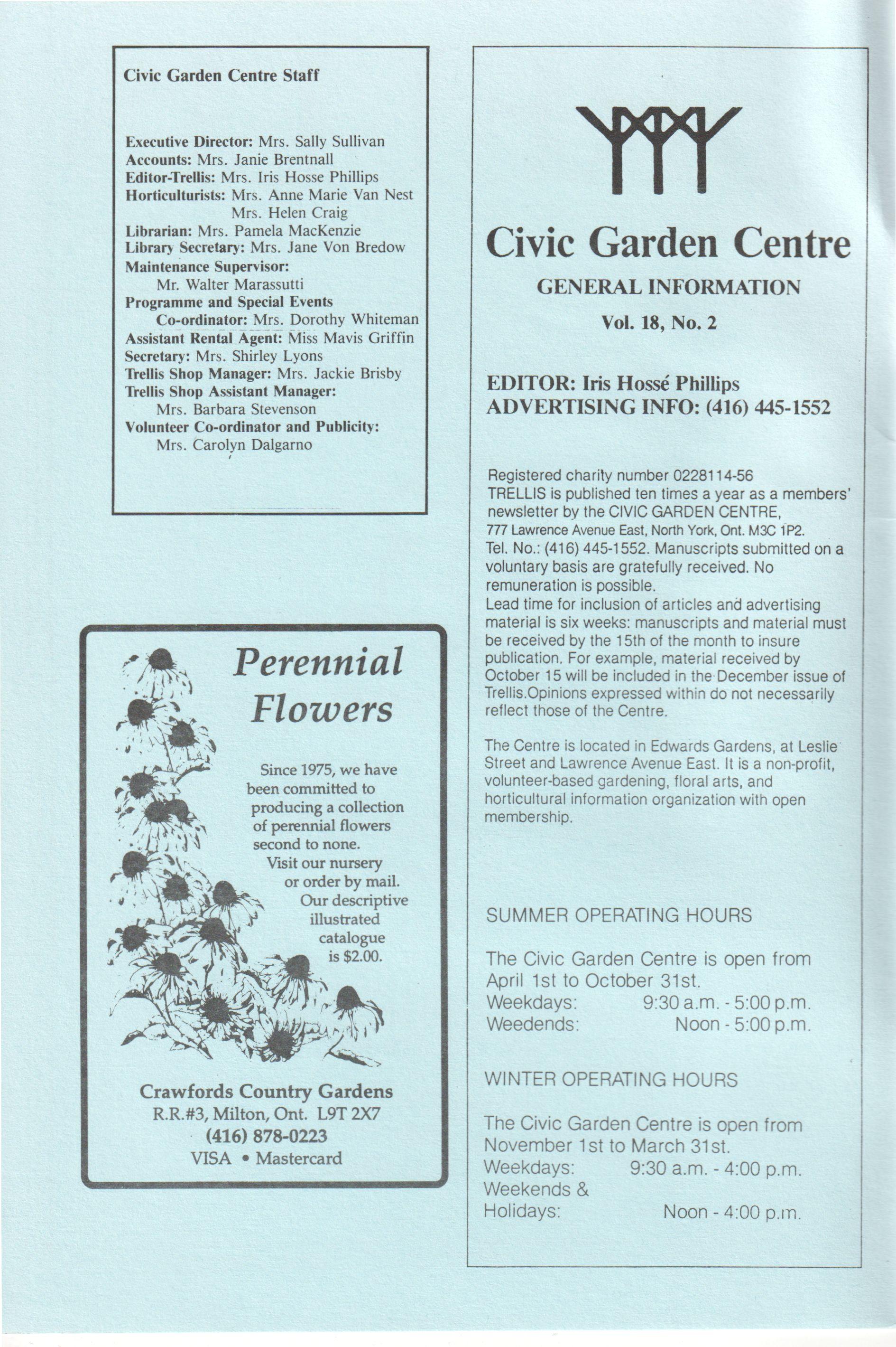 TRELLIS is published ten times a year as a members' newsletter by the CIVIC GARDEN CENTRE, 777 Lawrence Avenue East, North York, Ont. M3C 1P2. Tel. No.: (416) 445-1552. Manuscripts submitted on a voluntary basis are gratefully received. No remuneration is possible.