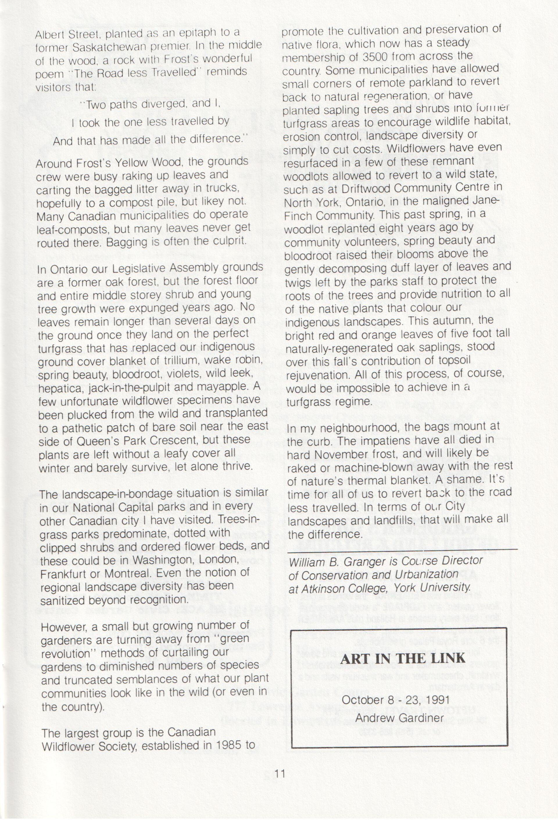 The landscape-in-bondage situation is similar in our National Capital parks and in every other Canadian city | have visited. Trees-ingrass parks predominate, dotted with clipped shrubs and ordered flower beds, and these could be in Washington, London, Frankfurt or Montreal. Even the notion of regional landscape diversity has been sanitized beyond recognition.