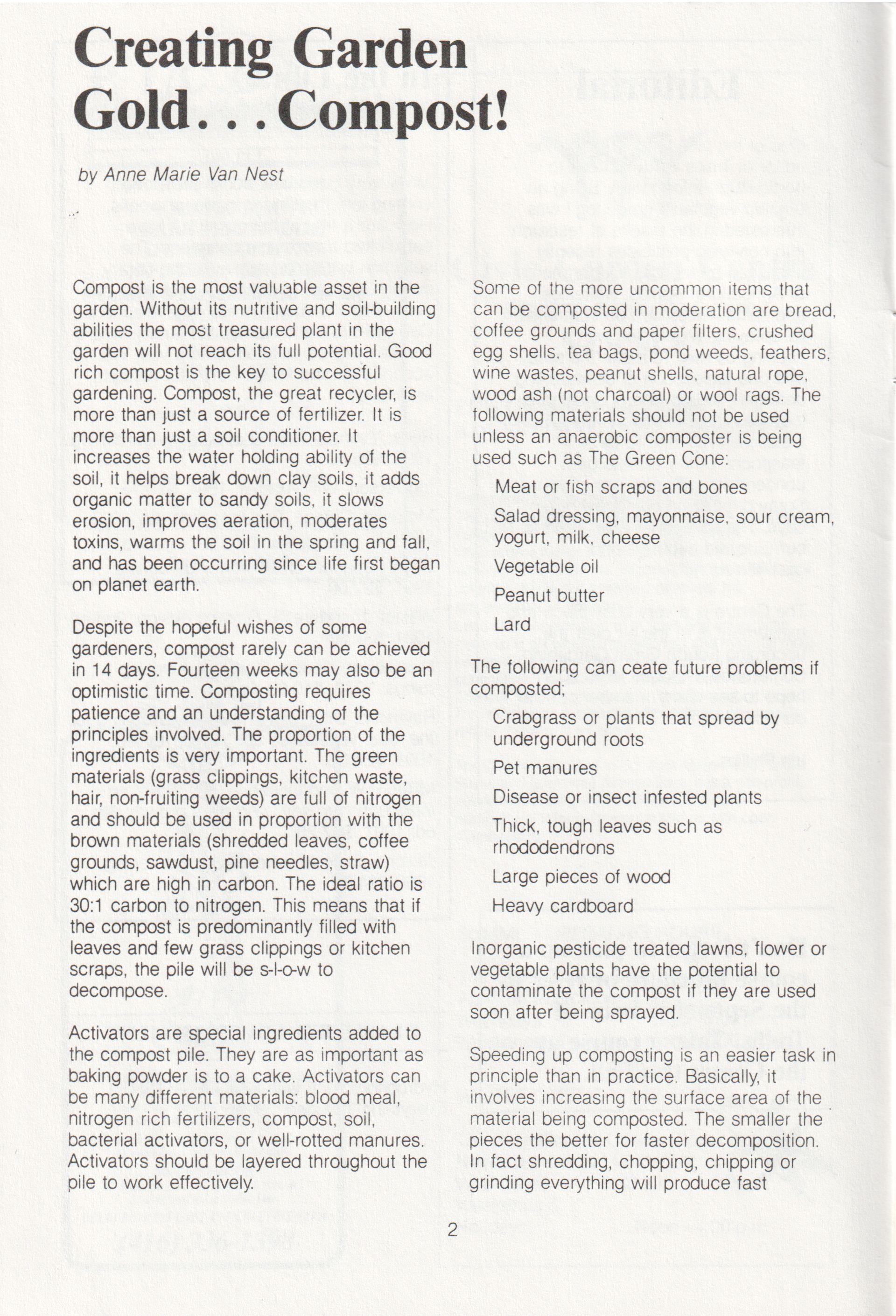 Compost is the most valuable asset in the garden. Without its nutritive and soil-building abilities the most treasured plant in the garden will not reach its full potential. Good rich compost is the key to successful gardening. Compost, the great recycler, is more than just a source of fertilizer. It is more than just a soil conditioner. It increases the water holding ability of the soil, it helps break down clay soils, it adds organic matter to sandy soils, it slows erosion, improves aeration, moderates toxins, warms the soil in the spring and fall, and has been occurring since life first began on planet earth.