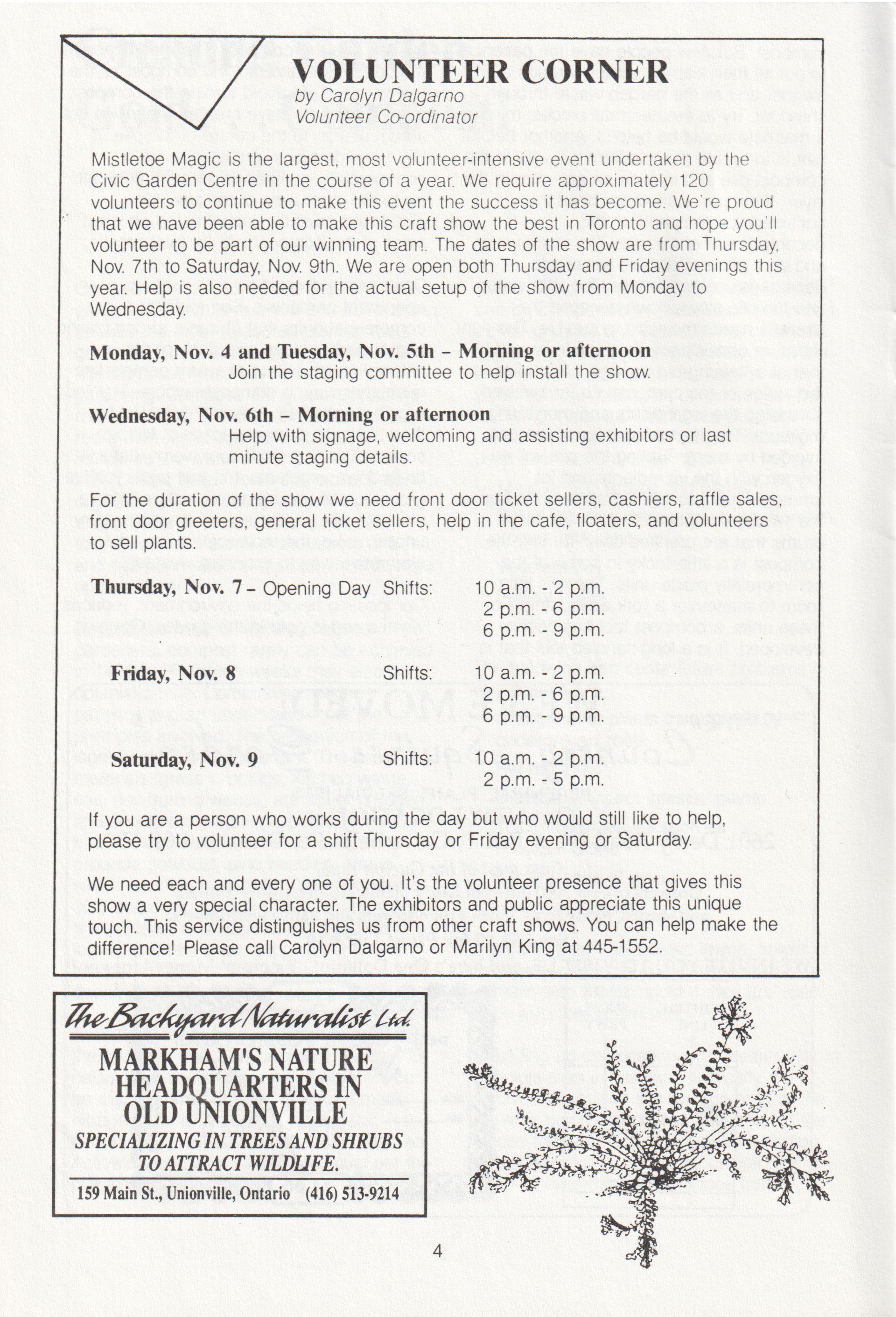 Mistletoe Magic is the largest, most volunteer-intensive event undertaken by the Civic Garden Centre in the course of a year. We require approximately 120 volunteers to continue to make this event the success it has become. We're proud that we have been able to make this craft show the best in Toronto and hope you'll volunteer to be part of our winning team. The dates of the show are from Thursday, Nov. 7th to Saturday, Nov. 9th. We are open both Thursday and Friday evenings this year. Help is also needed for the actual setup of the show from Monday to Wednesday.