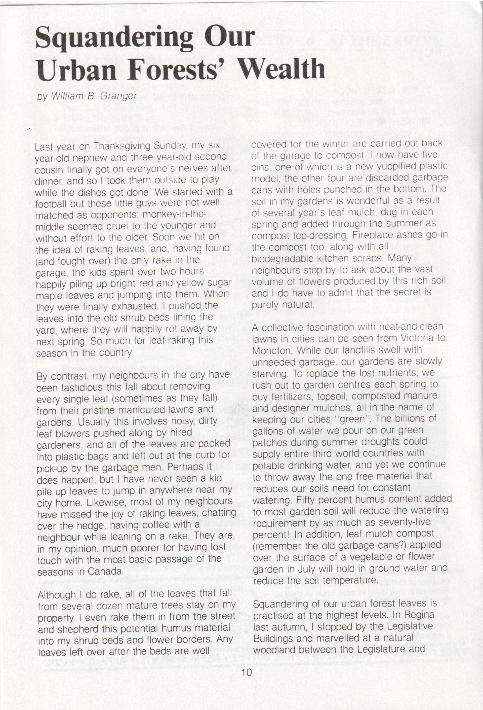Squandering of our urban forest leaves is practised at the highest levels. In Regina last autumn, stopped by the Legislative Buildings and marvelled at a natural woodland between the Legislature and