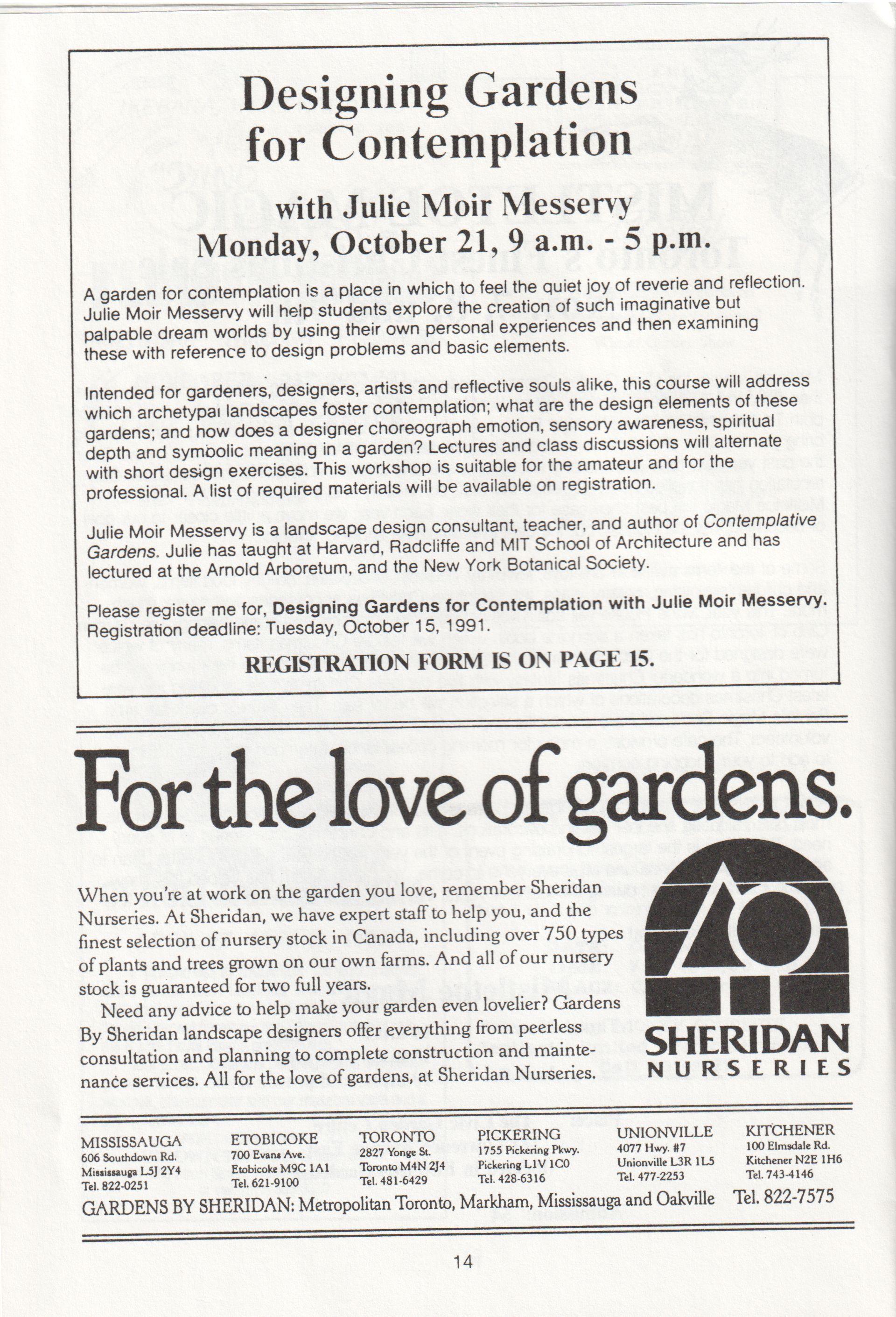 Please register me for, Designing Gardens for Contemplation with Julie Moir Messervy. Registration deadline: Tuesday, October 15, 1991.