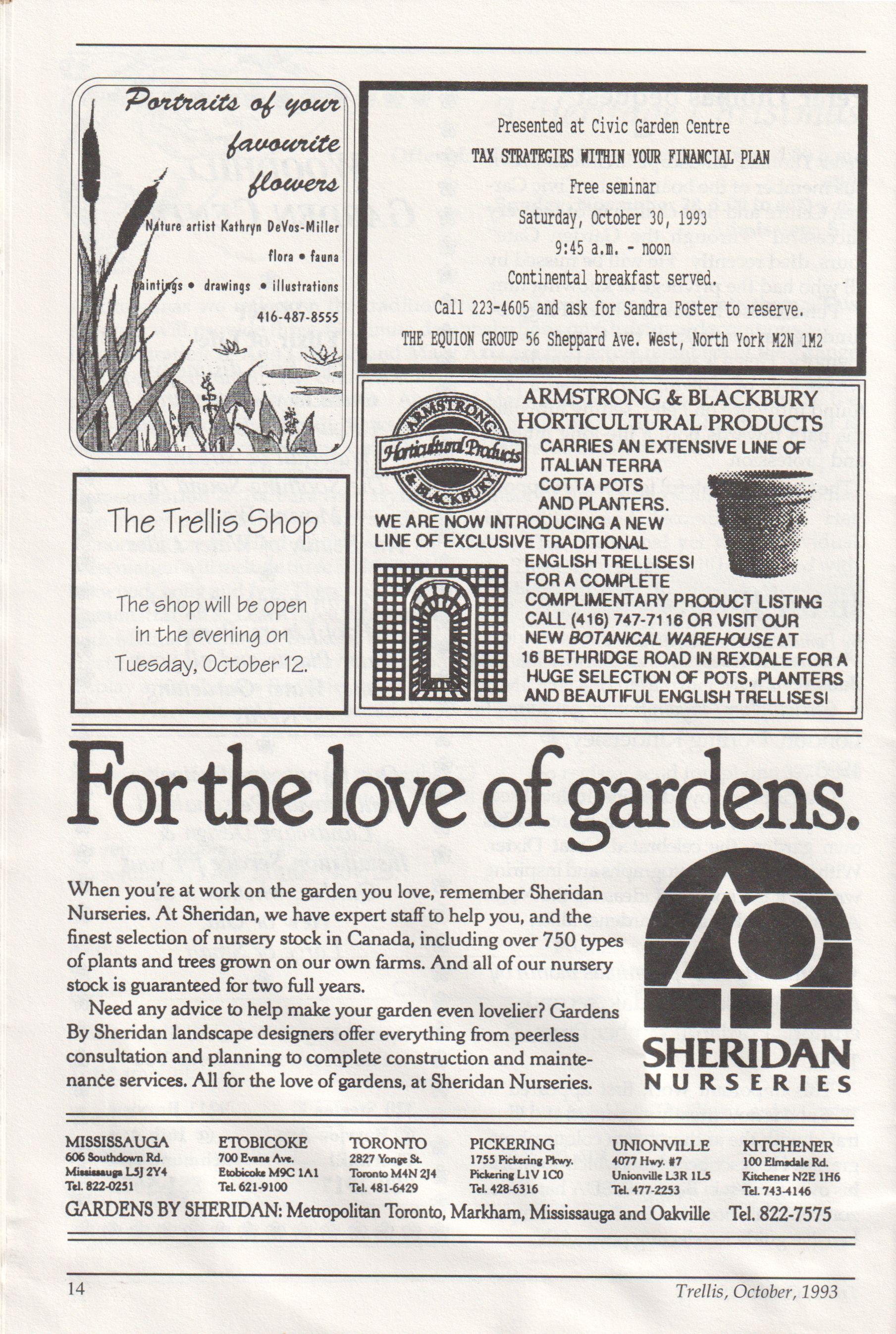 The Trellis Sh WEARENOWINTRO?DTJ%INGANEERvs S LINEOFEXCLUSIVETRADITIONAL d ENGLISHTRELLISESI FORACOMPLETE COMPLIMENTARYPRODUCTLISTING CALL(416)747-7116ORVISITOUR NEWBOTANICAL WAREHOUSEAT 16BETHRIDGE ROADINREXDALEFORAHUGESELECTIONOF POTS,PLANTERSANDBEAUTIFULENGLISHTRELLISES!
