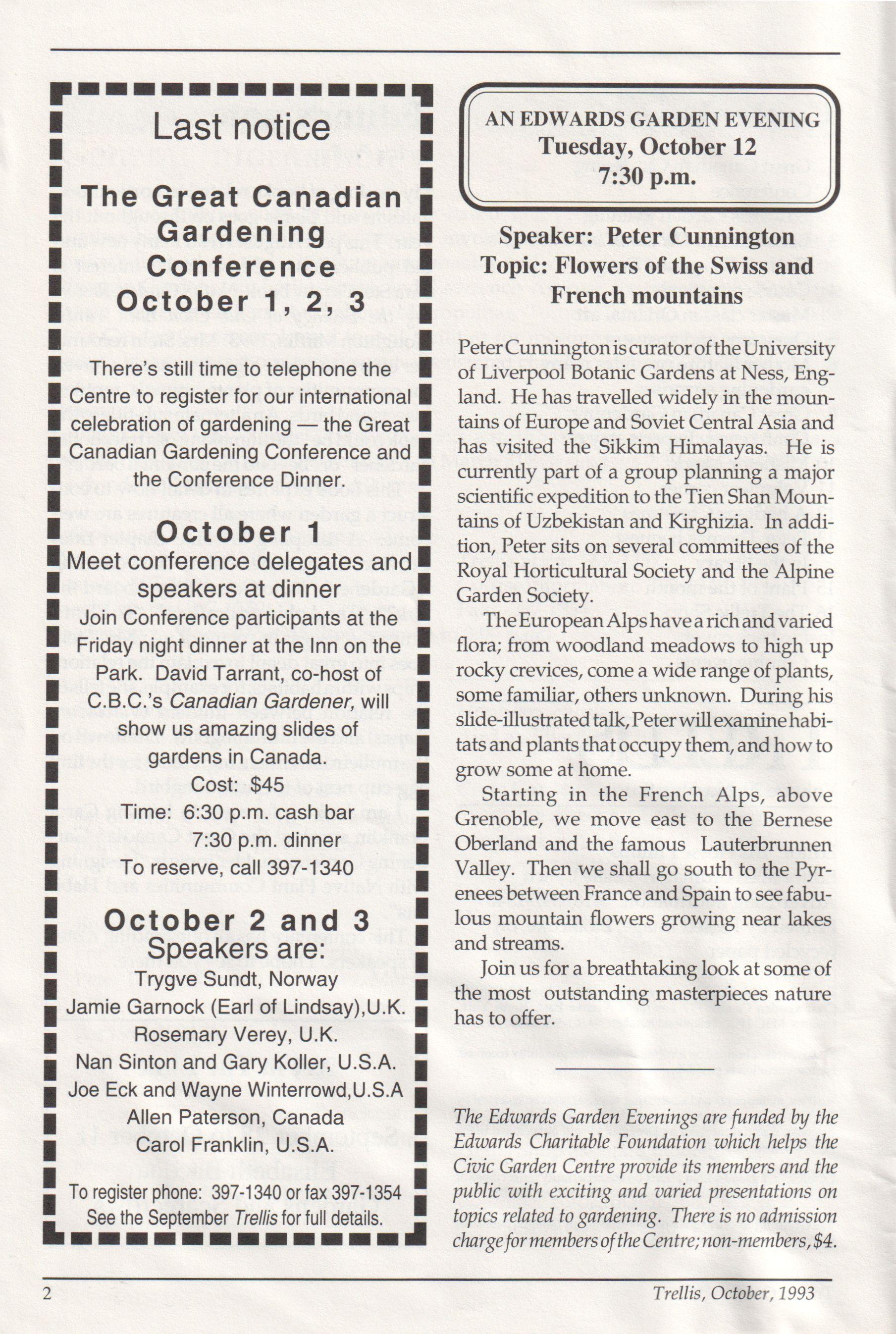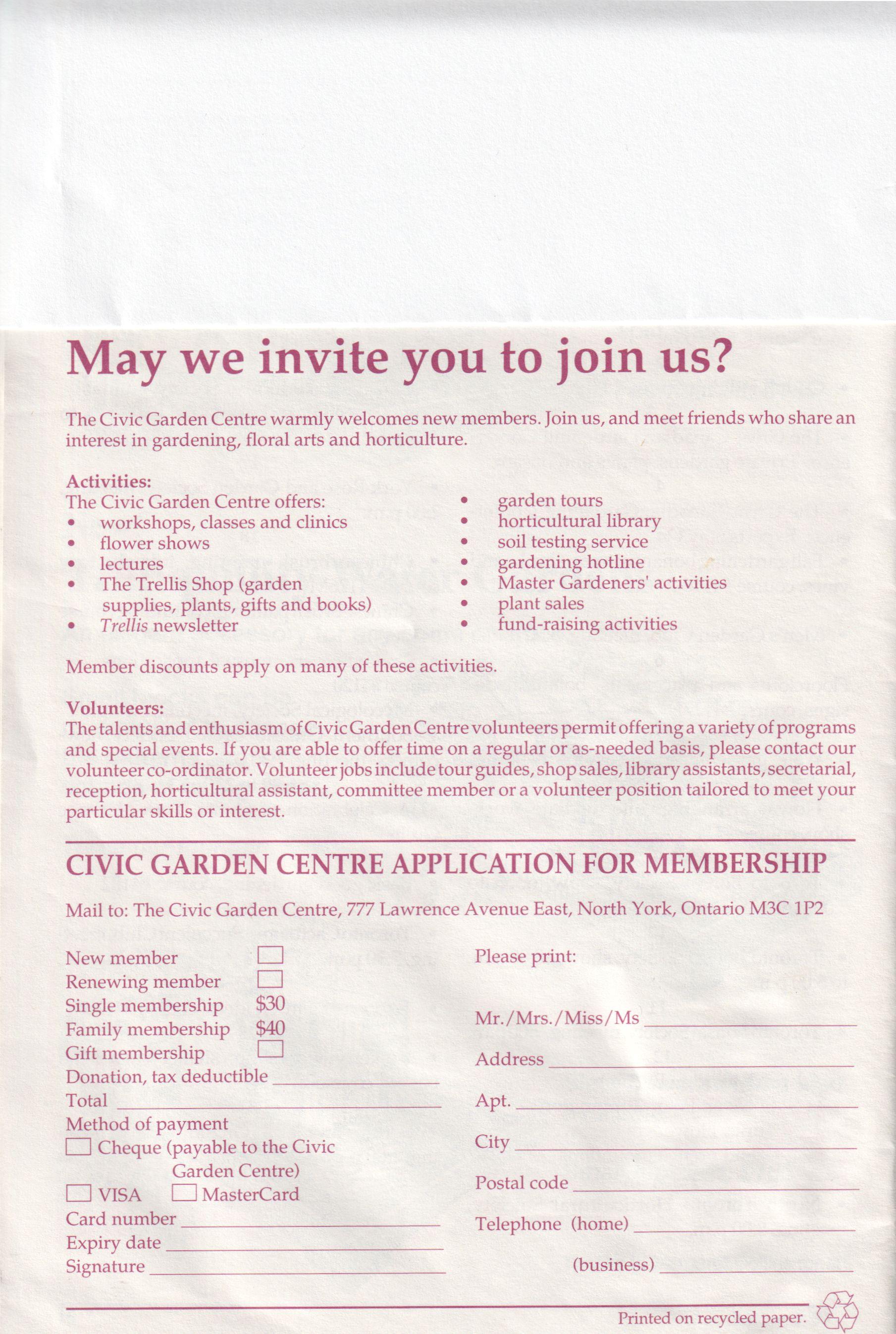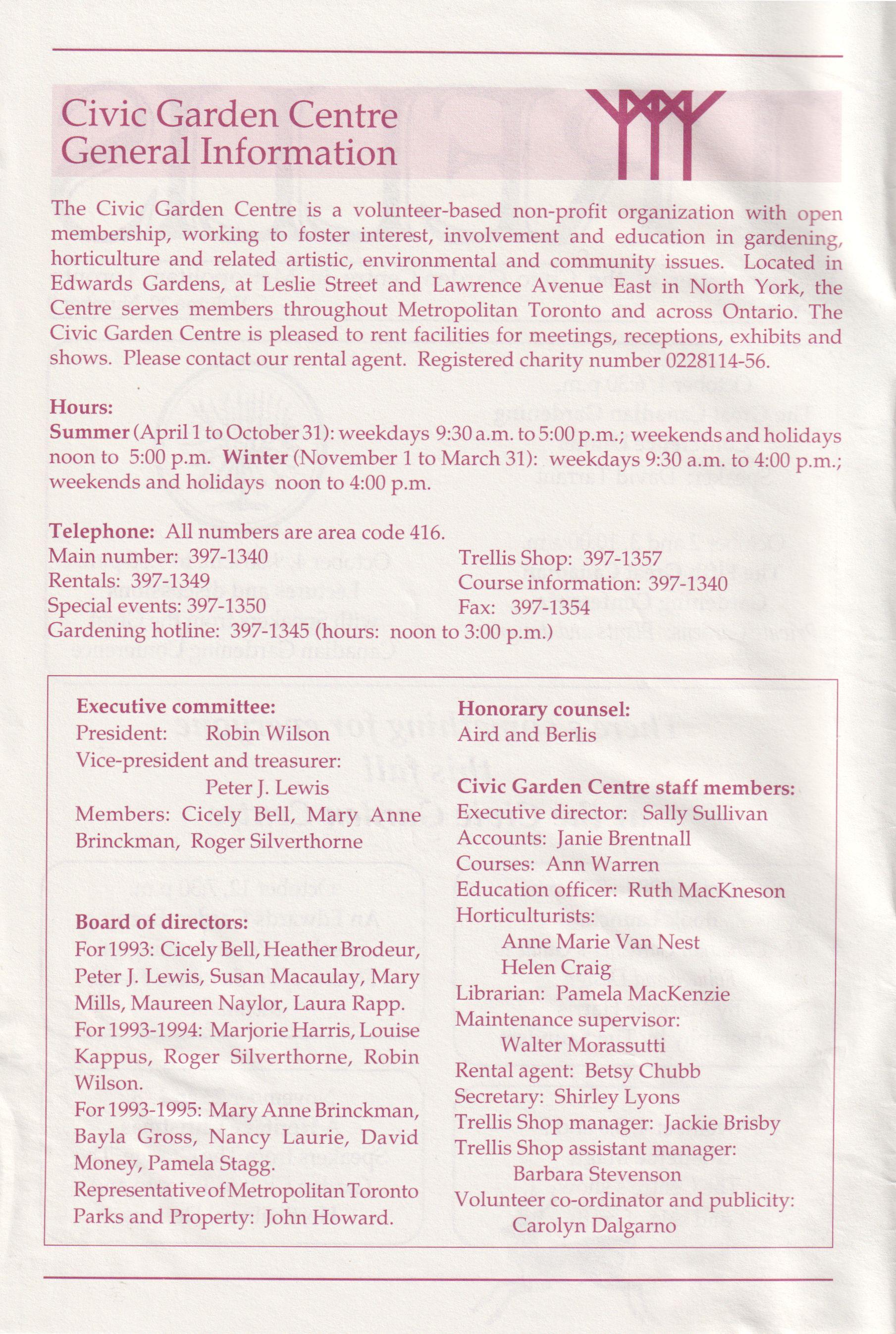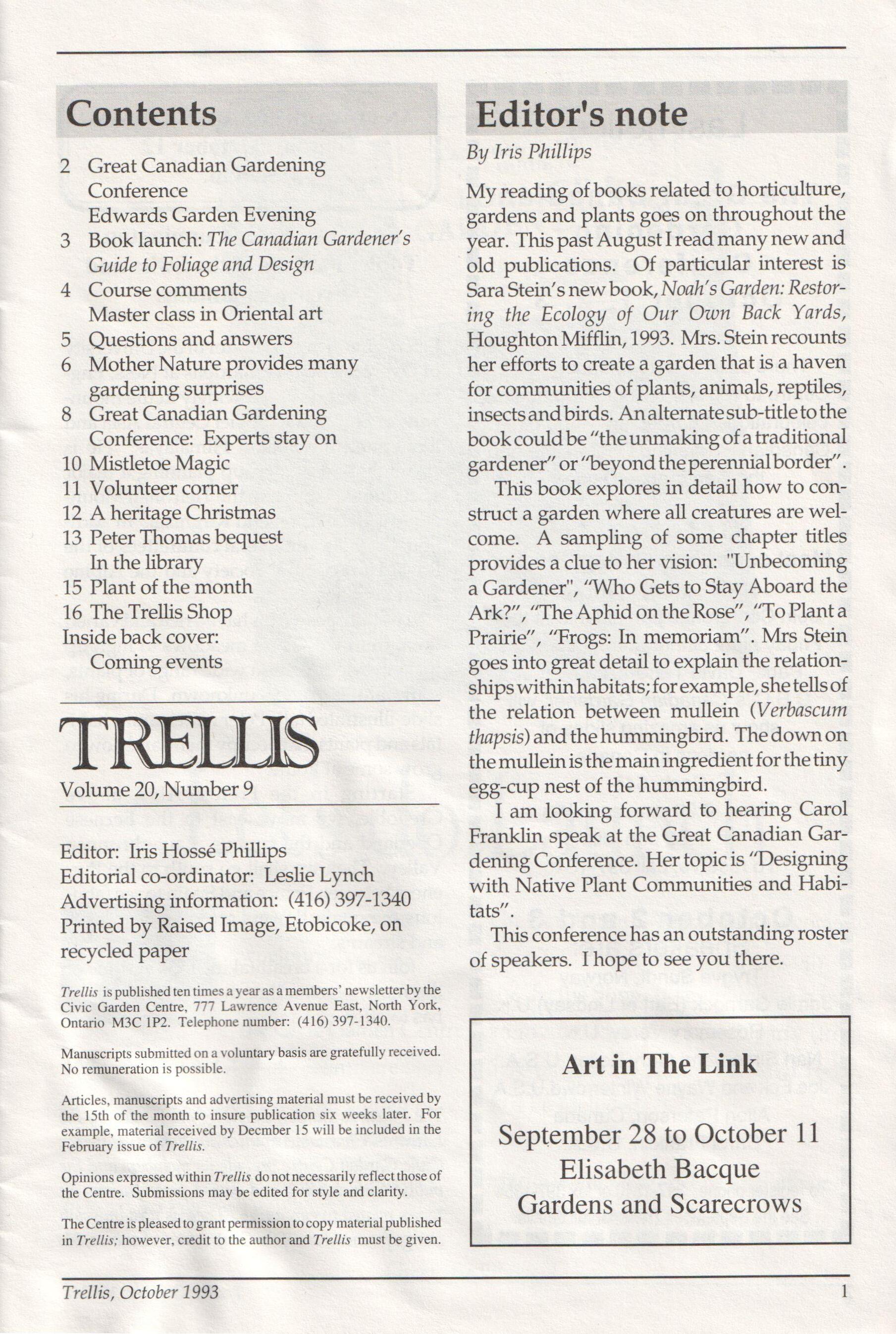 Trellis is published ten times a year as a members newsletter by the Civic Garden Centre, 777 Lawrence Avenue East, North York, Ontario M3C 1P2. Telephone number: (416) 397-1340.