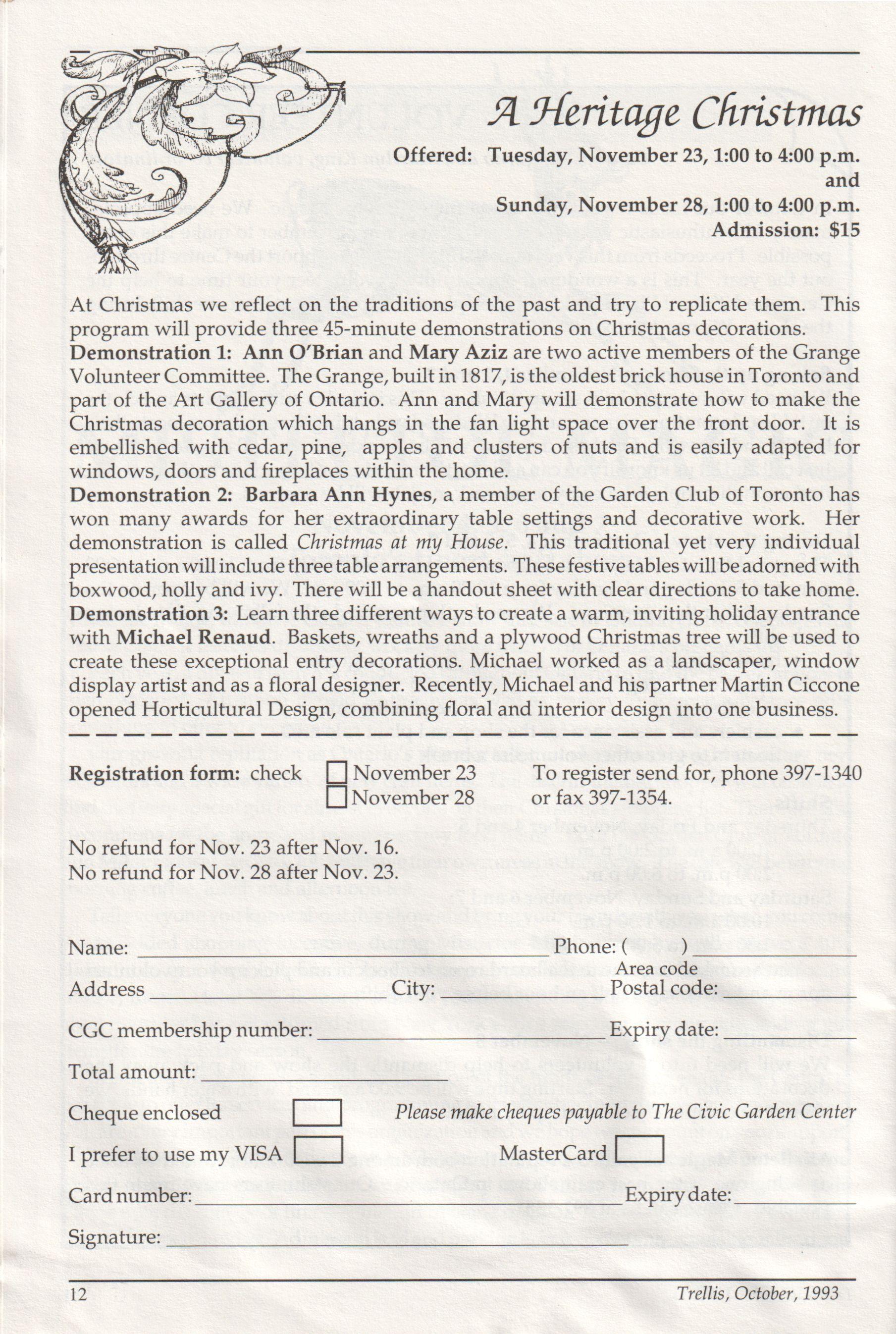 Demonstration 1: Ann O Brian and Mary Aziz are two active members of the Grange VolunteerCommittee. TheGrange,builtin 1817, is theoldestbrickhouseinToronto and part of the Art Gallery of Ontario. Ann and Mary will demonstrate how to make the Christmas decoration which hangs in the fan light space over the front door. It is embellished with cedar, pine, apples and clusters of nuts and is easily adapted for windows, doors and fireplaces within the home.
