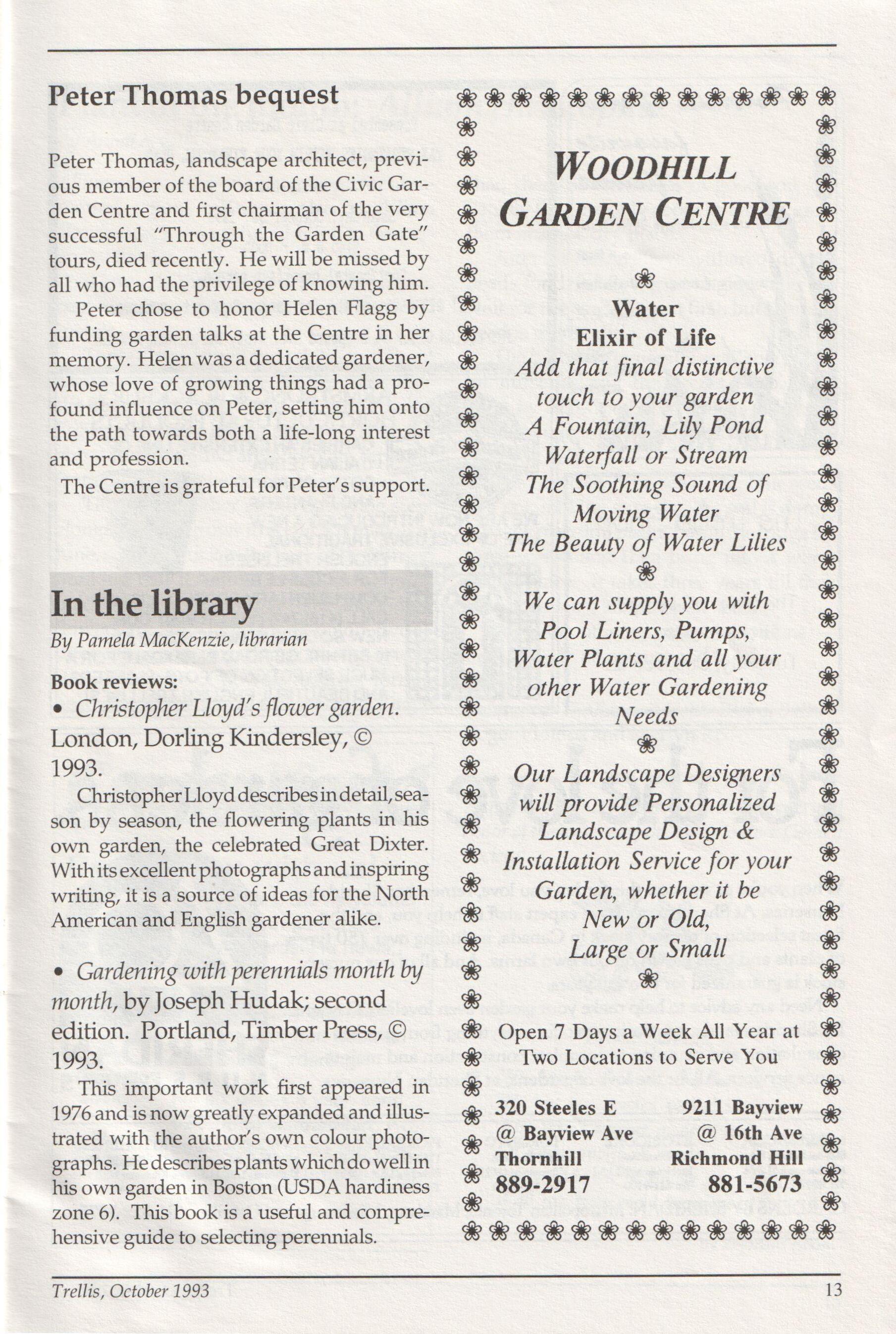 Peter Thomas, landscape architect, previous member of the board of the Civic Garden Centre and first chairman of the very successful Through the Garden Gate tours, died recently. He willbe missed by all who had the privilege ofknowing him.