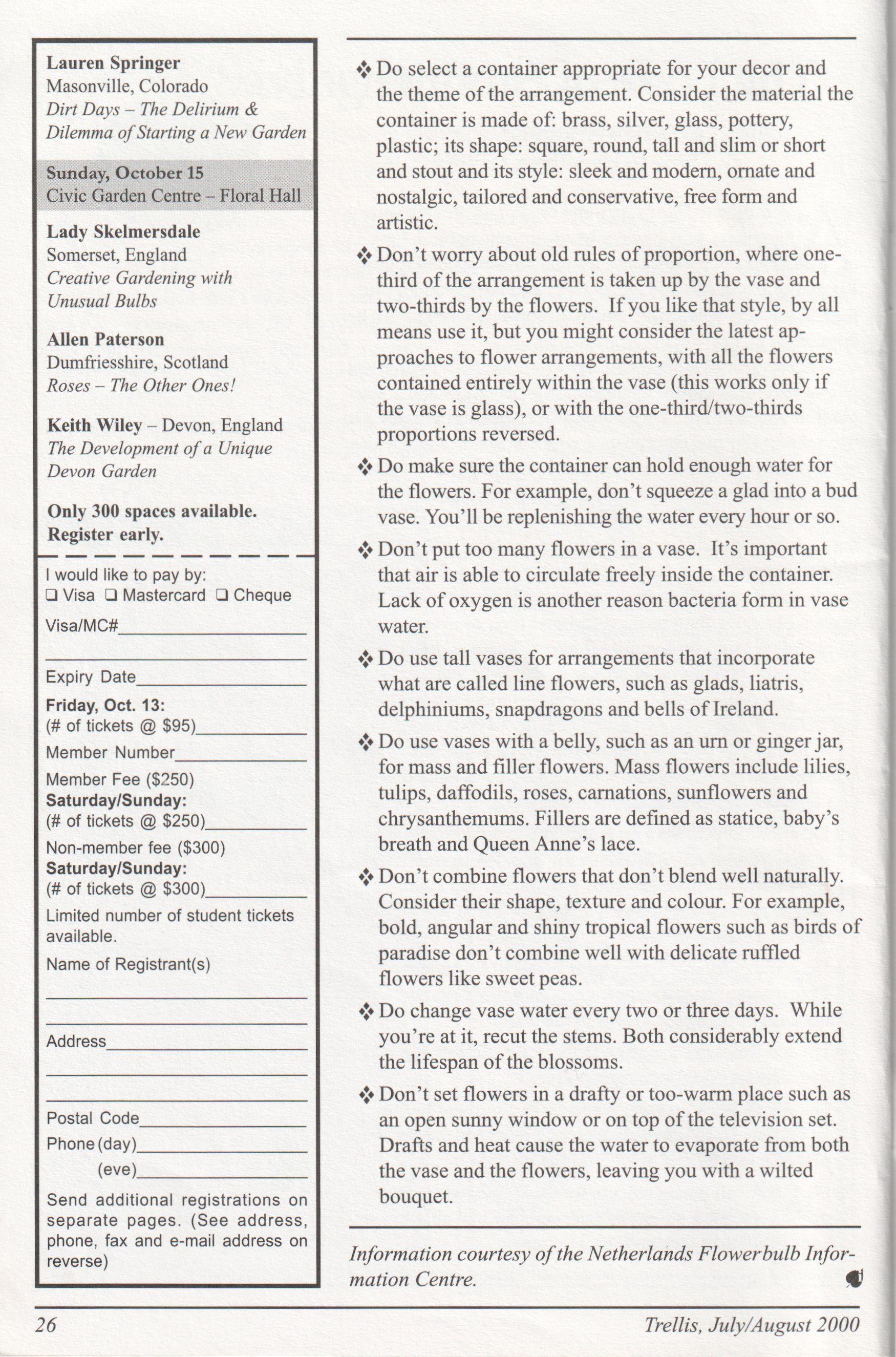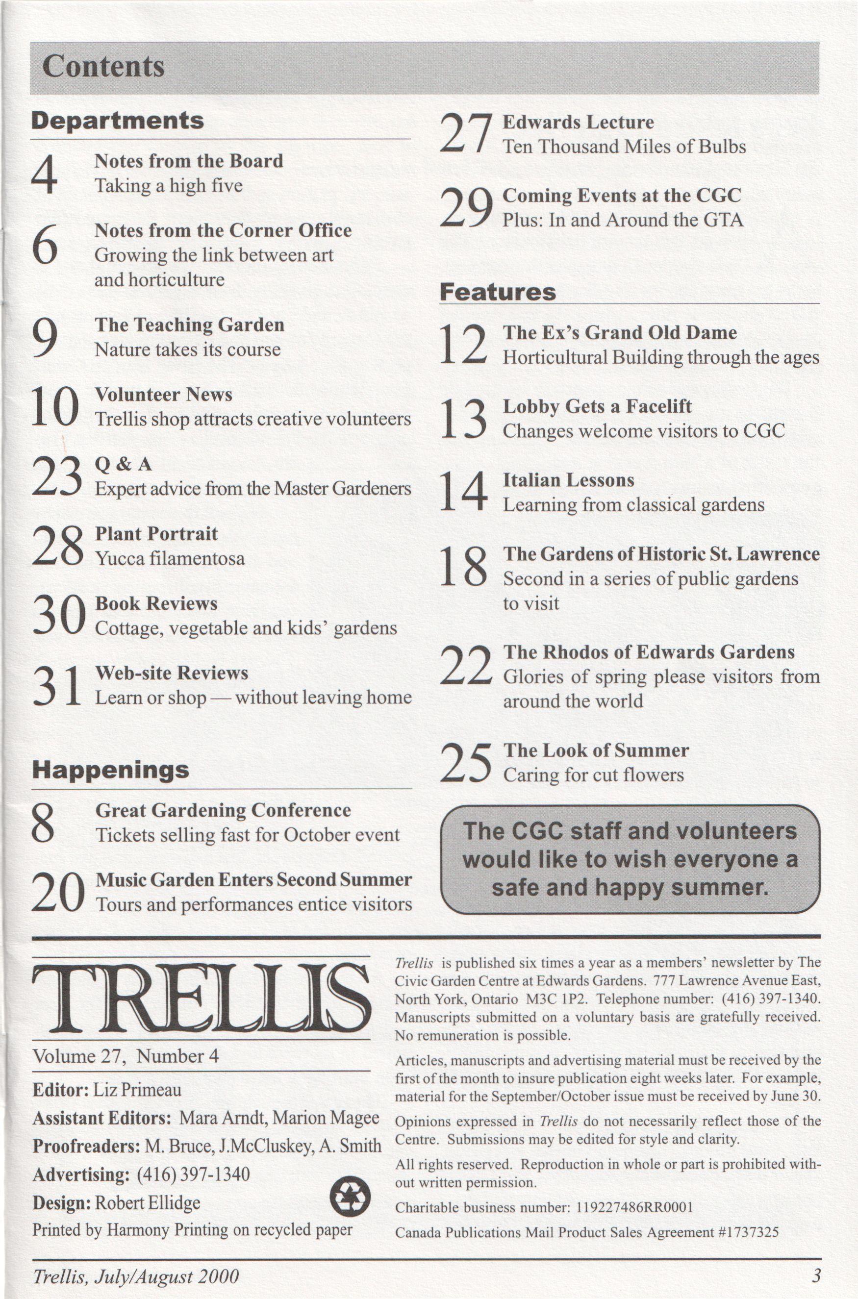 Articles, manuscripts and advertising material must be received by the first ofthe month to insurepublicationeightweeks later. Forexample, material forthe September/October issue mustbe received byJune 30. Opinions expressed in Trellis do not necessarily reflect those of the Centre. Submissions may be edited for style and clarity.