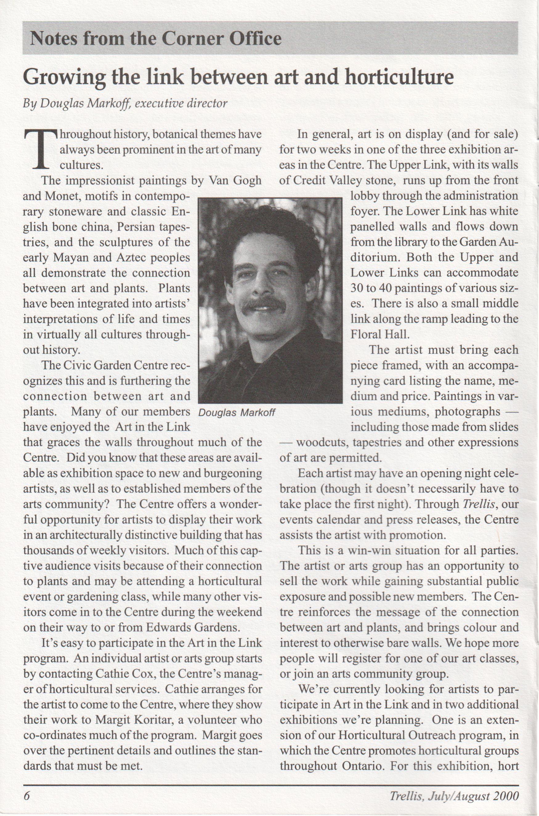Underthe leadership ofexecutive director Douglas Markoff, the staffnow in place some have been with us a longtime and others are morerecent arrivals are providing a higher and more professional level ofservicethan everbefore. Whether it is in horticultural services, community services,volunteerservices (wherewewelcome ournewestpaid employee, Carol Gardner), the library, the children s Teaching Garden, programming, facilities bookings, administration ormaintenance, the staffis doing anexceptionaljob.