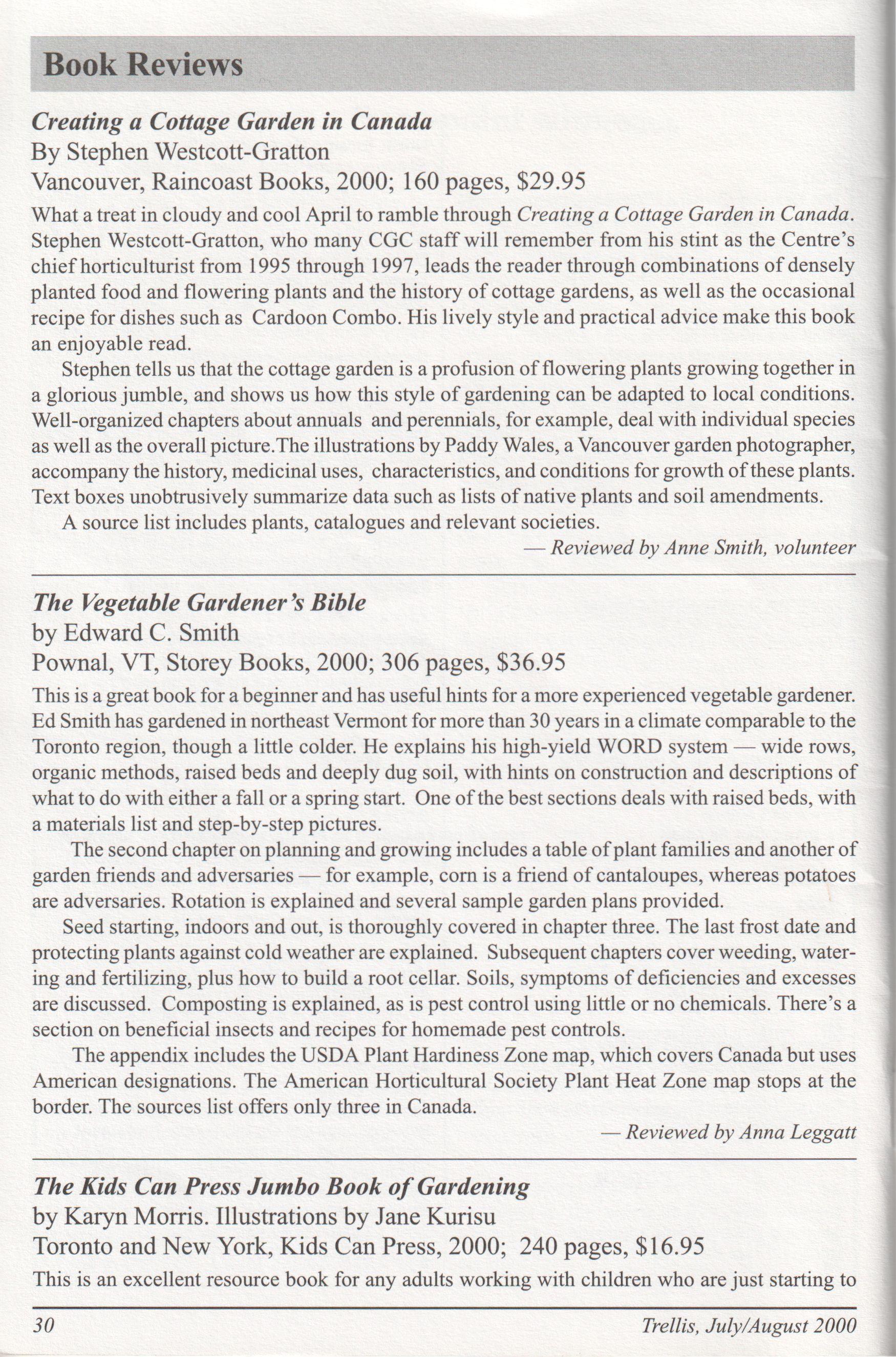 What a treat in cloudy and cool April to ramble through Creatinga Cottage Garden in Canada. Stephen Westcott-Gratton, who many CGC staffwill remember from his stint as the Centre s chiefhorticulturist from 1995 through 1997, leads the reader through combinations ofdensely planted food and flowering plants and the history ofcottage gardens, as well as the occasional recipe for dishes such as Cardoon Combo. His lively style and practical advice make this book an enjoyable read.