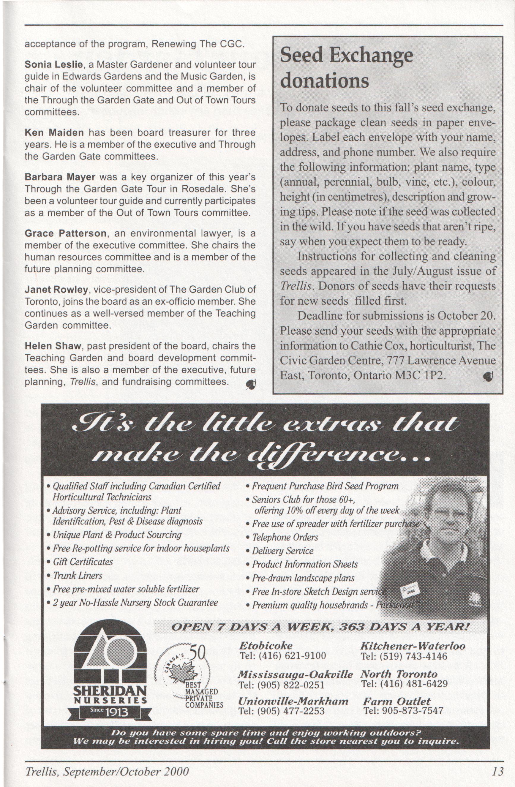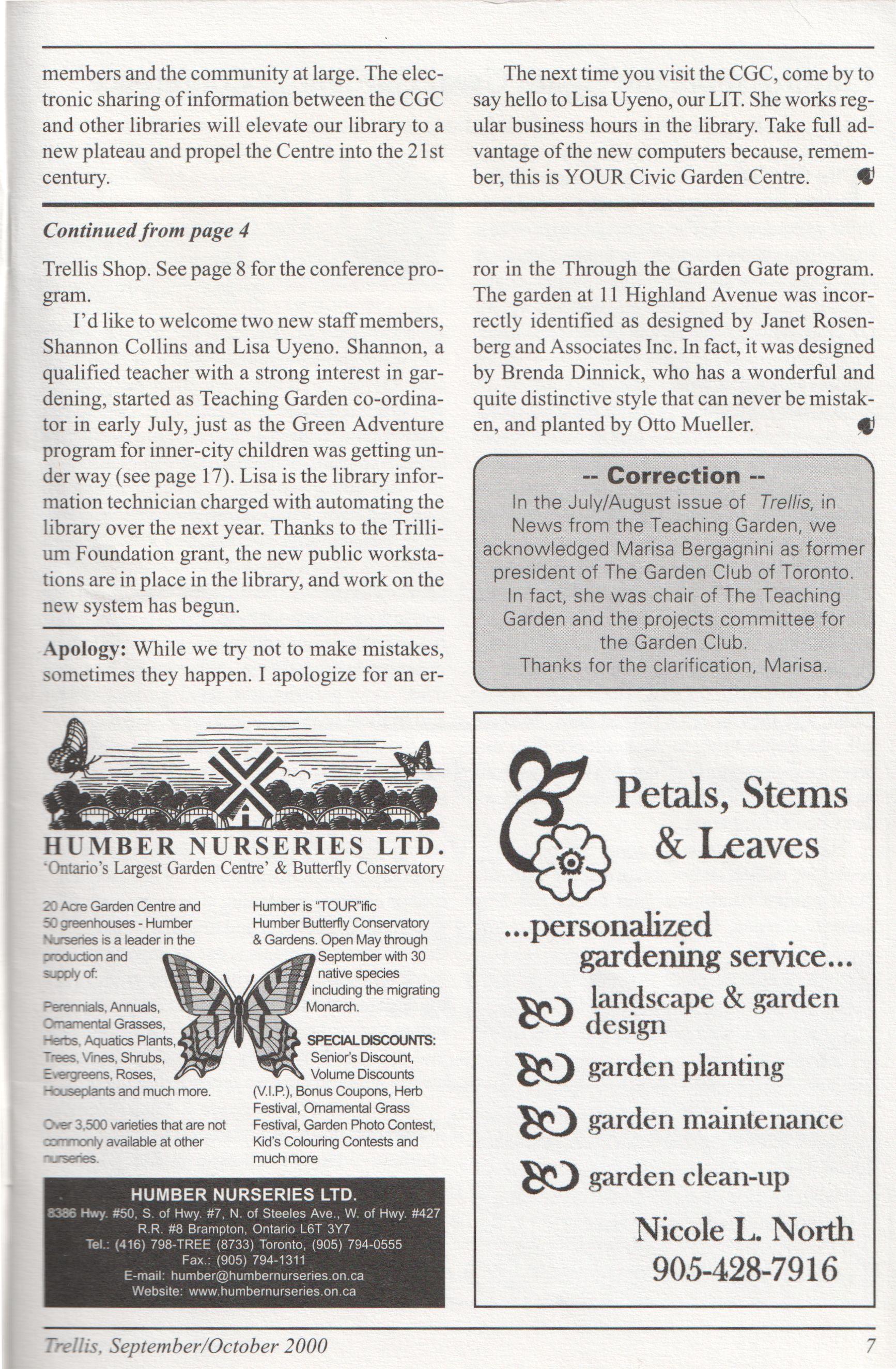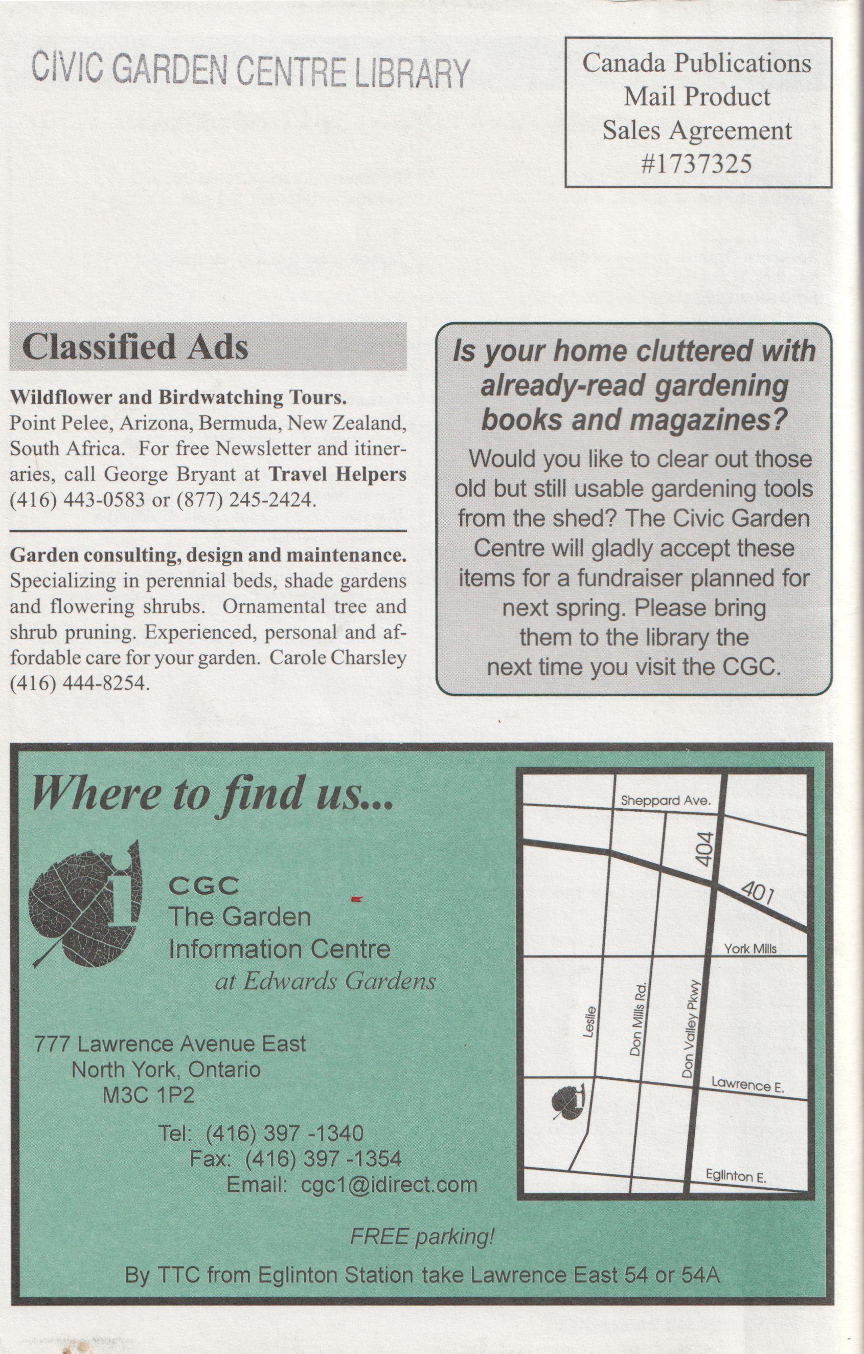 Trellis is published six times a year as a members newsletter by The Civic Garden Centre at Edwards Gardens. 777 Lawrence Avenue East, North York, Ontario M3C 1P2. Telephone number: (416) 397-1340. Manuscripts submitted on avoluntary basis are gratefully received. No remuneration is possible.