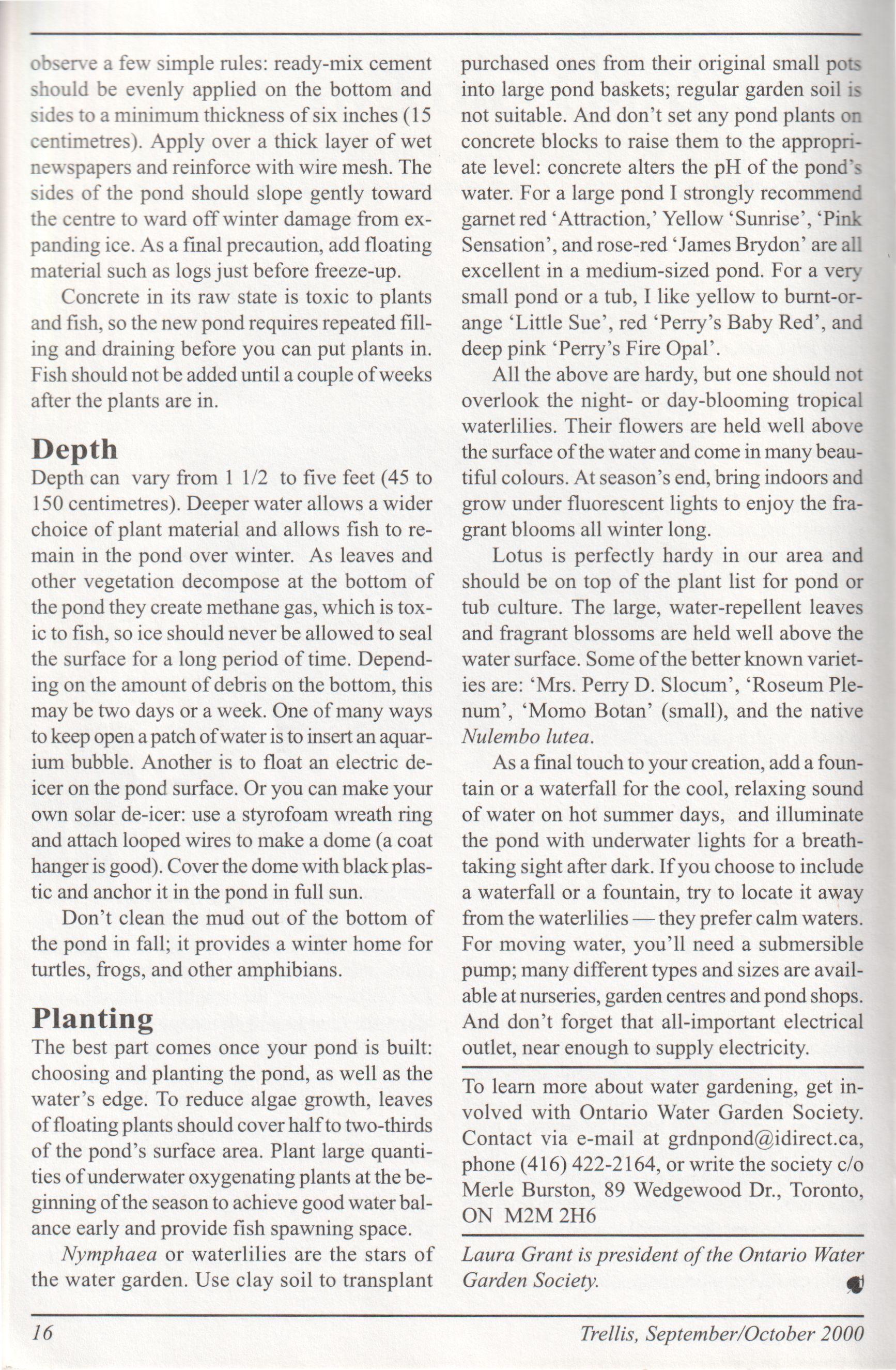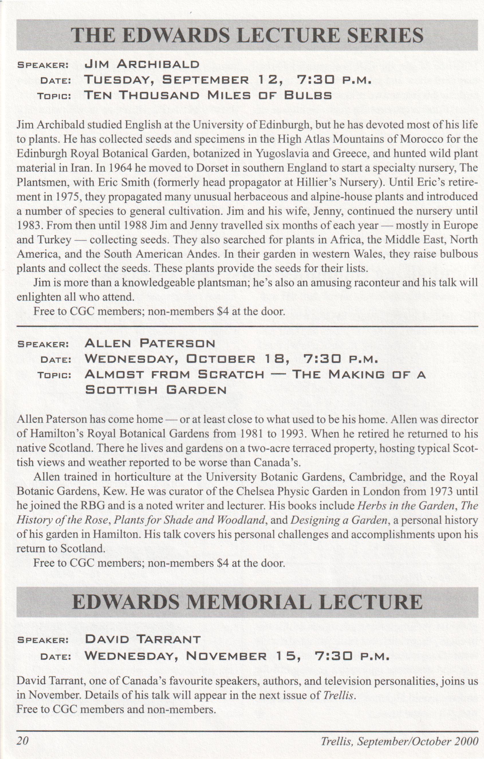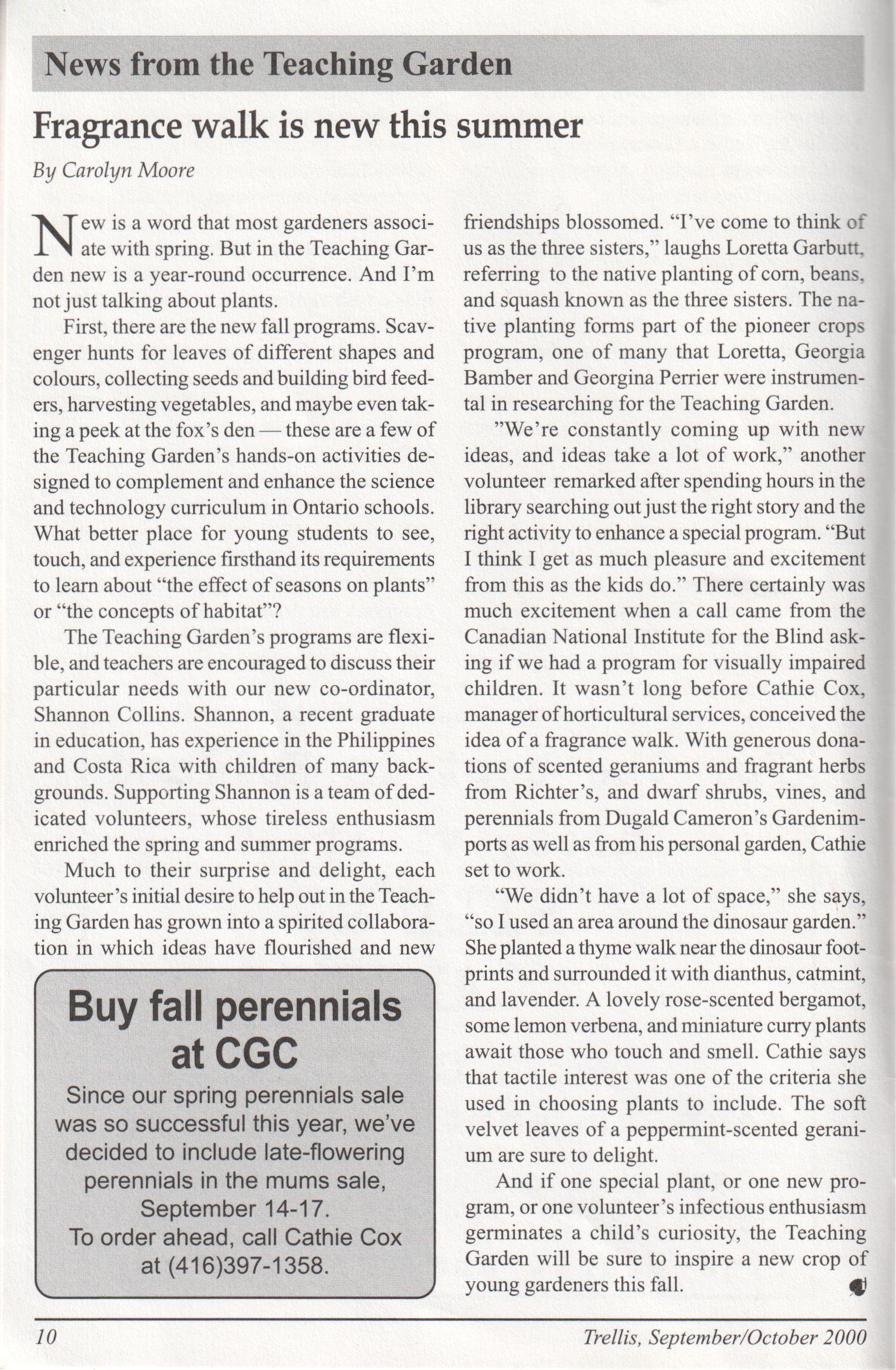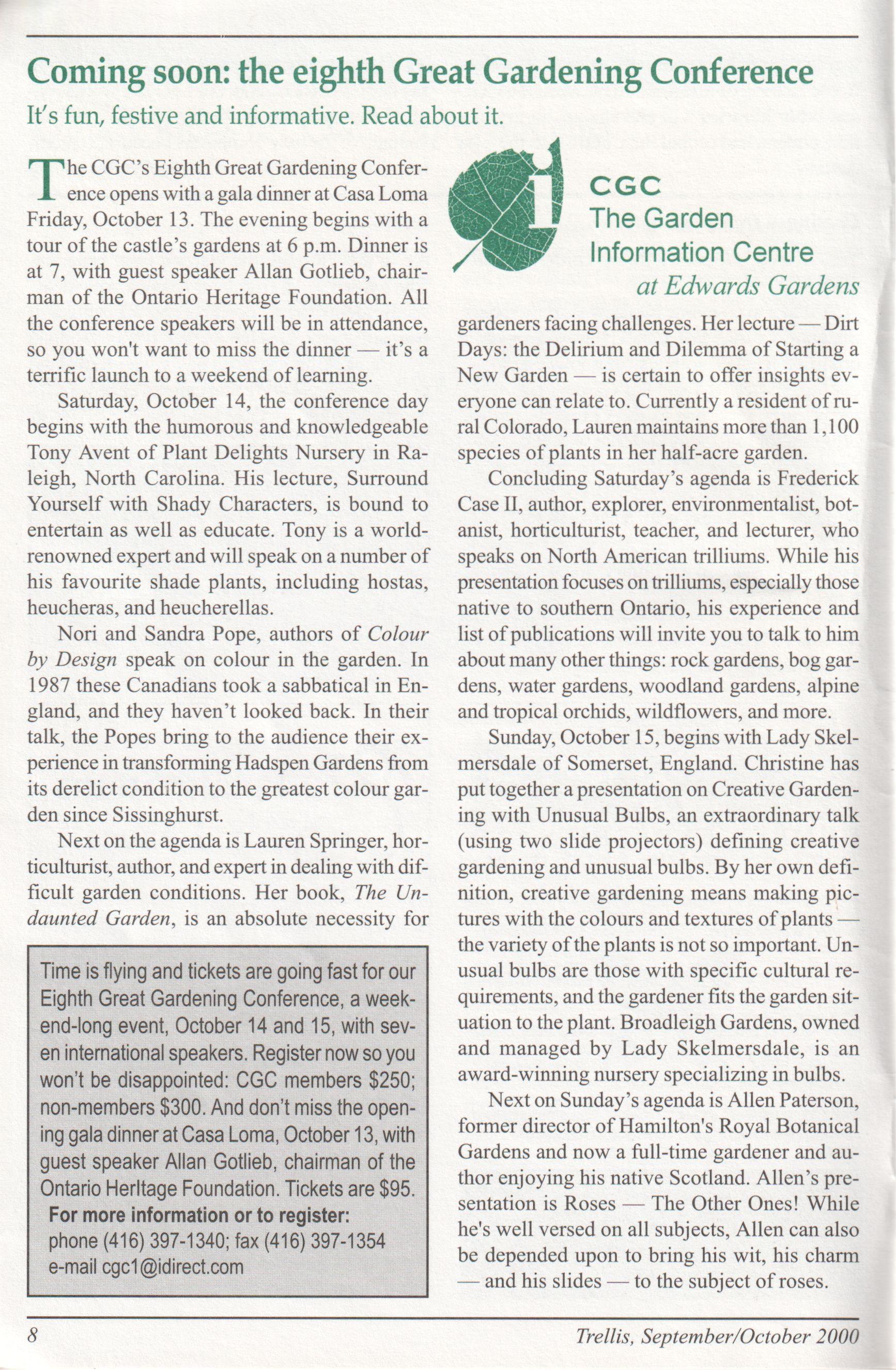 Trellis is published six times a year as a members newsletter by The Civic Garden Centre at Edwards Gardens. 777 Lawrence Avenue East, North York, Ontario M3C 1P2. Telephone number: (416) 397-1340. Manuscripts submitted on avoluntary basis are gratefully received. No remuneration is possible.